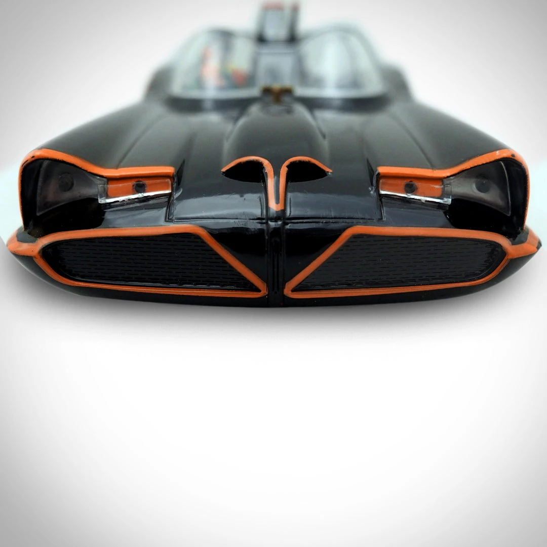 True to scale in every detail: a die-cast metal body, a metal chassis, detailed wheels, chrome accents and an accurate paint job. It’s detailed with dozens of specially-applied parts to precisely recreate in impeccable detail the famous Batmobile featured in the Classic Batman television series. The result is a fantastic realism.