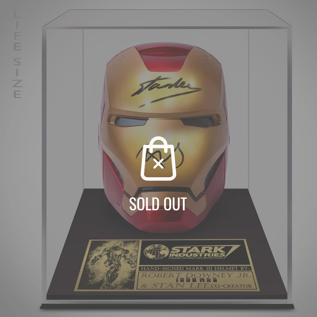 Pay homage to one of the most iconic Marvel characters, Iron Man, with this absolute masterpiece, a museum custom display featuring an Iron Man helmet realistic Life-Size prop dually Hand-Signed by actor Robert Downey Jr and by the man himself – Marvel Co-Founder, Stan Lee, the creator of Iron Man character as well as the Executive producer of all Marvel Movies.