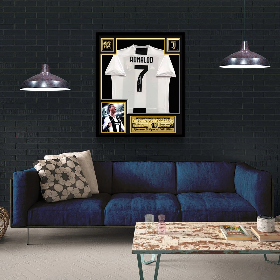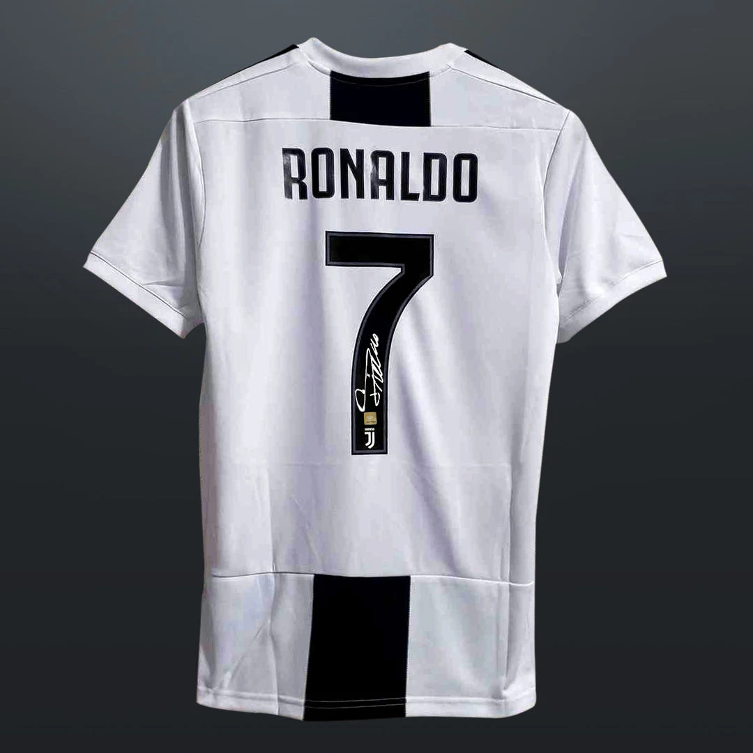 Pay homage to CR7 and one of the greatest soccer players of all time with this absolute masterpiece, a Juventus 2019 Home Adidas Jersey hand signed by soccer legend Cristiano Ronaldo. Protagonist of one of the most shocking transfers in Soccer history when he left Real Madrid in summer of 2018 for the mythical italian club Juventus, who has won 7 consecutive League titles. 7, just as Ronaldo jersey number… Both a prolific goalscorer, naturally gifted, and a stellar playmaker, Ronaldo is often considered the best player in the world. He has won a record-tying five Ballon d’Or awards, and the first player to win four European Golden Shoes. He has won 26 trophies, including five La Liga titles, five UEFA Champions League titles, and he also led Portugal to an Epic UEFA European Championship in 2016. Ronaldo holds the records for most official goals scored in Europe’s top-five leagues, the UEFA Champions League, the UEFA European Championship. He has scored over 680 senior career goals for club and country. Ronaldo is noted for his work ethic, elite body conditioning, and dedication to improvement on the training pitch, as well being regarded as a natural leader. Owing to his year after year achievements, charisma, and Soccer dominance, he is widely considered to be one of the greatest if not the Greatest Soccer player of all time and one of the most fascinating athletes of the 21st Century.
