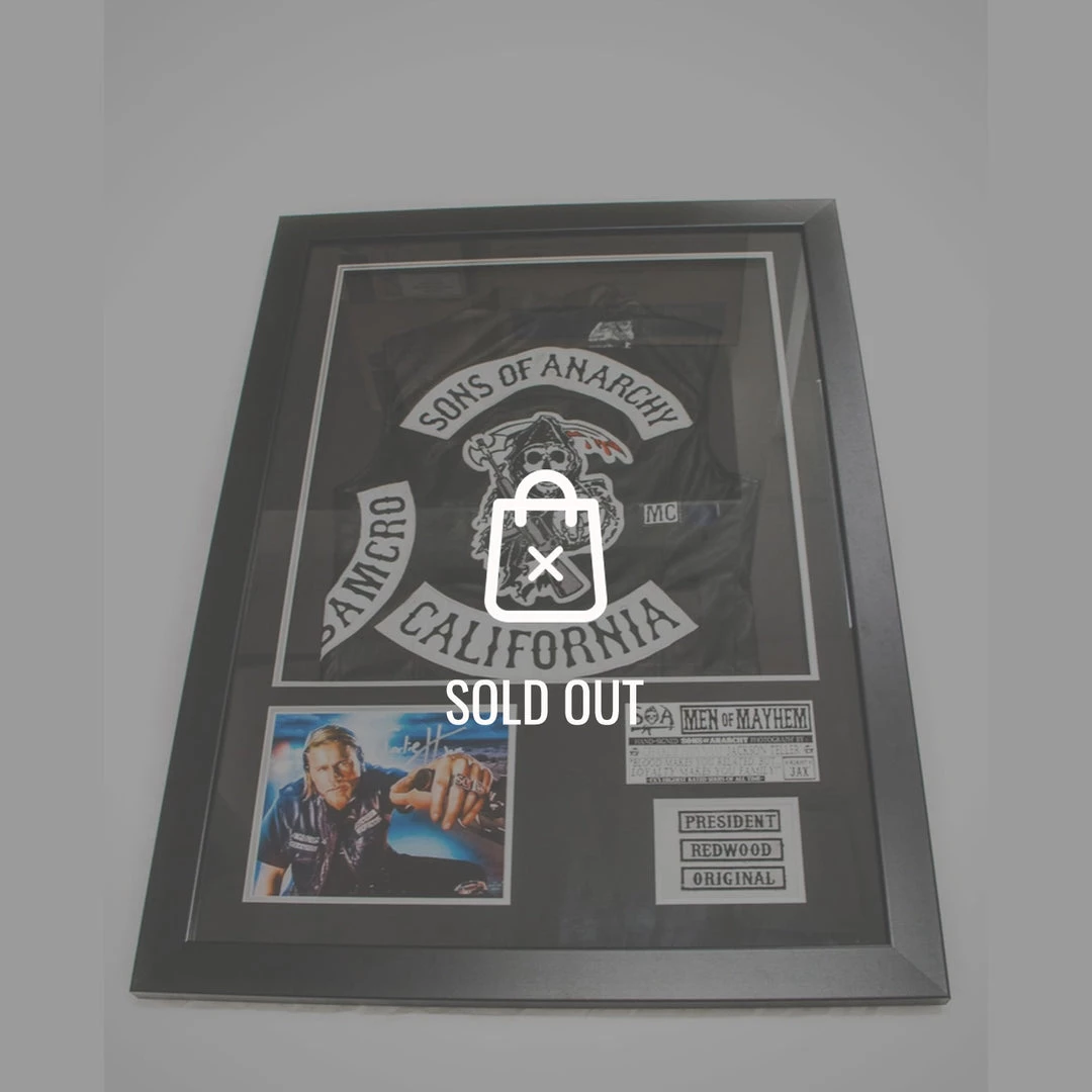 This VIP frame showcases a Sons of Anarchy vest and photograph signed by the President himself – Jax Teller (aka Charlie Hunnam), protected under glass – ensuring protection of your investment while allowing you to fully appreciate this collectible from one of television’s most memorizing shows – as well as a brushed aluminium plate explaining the contents within to all. A truly luxurious frame to show off SOA memorabilia!