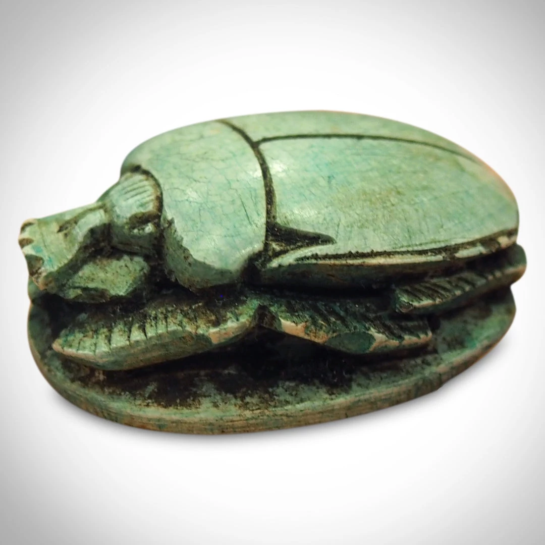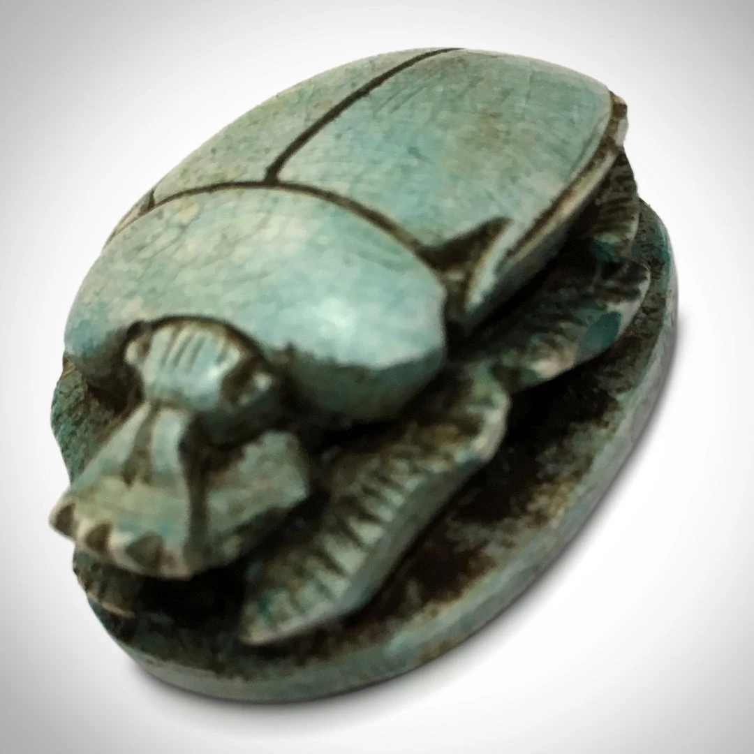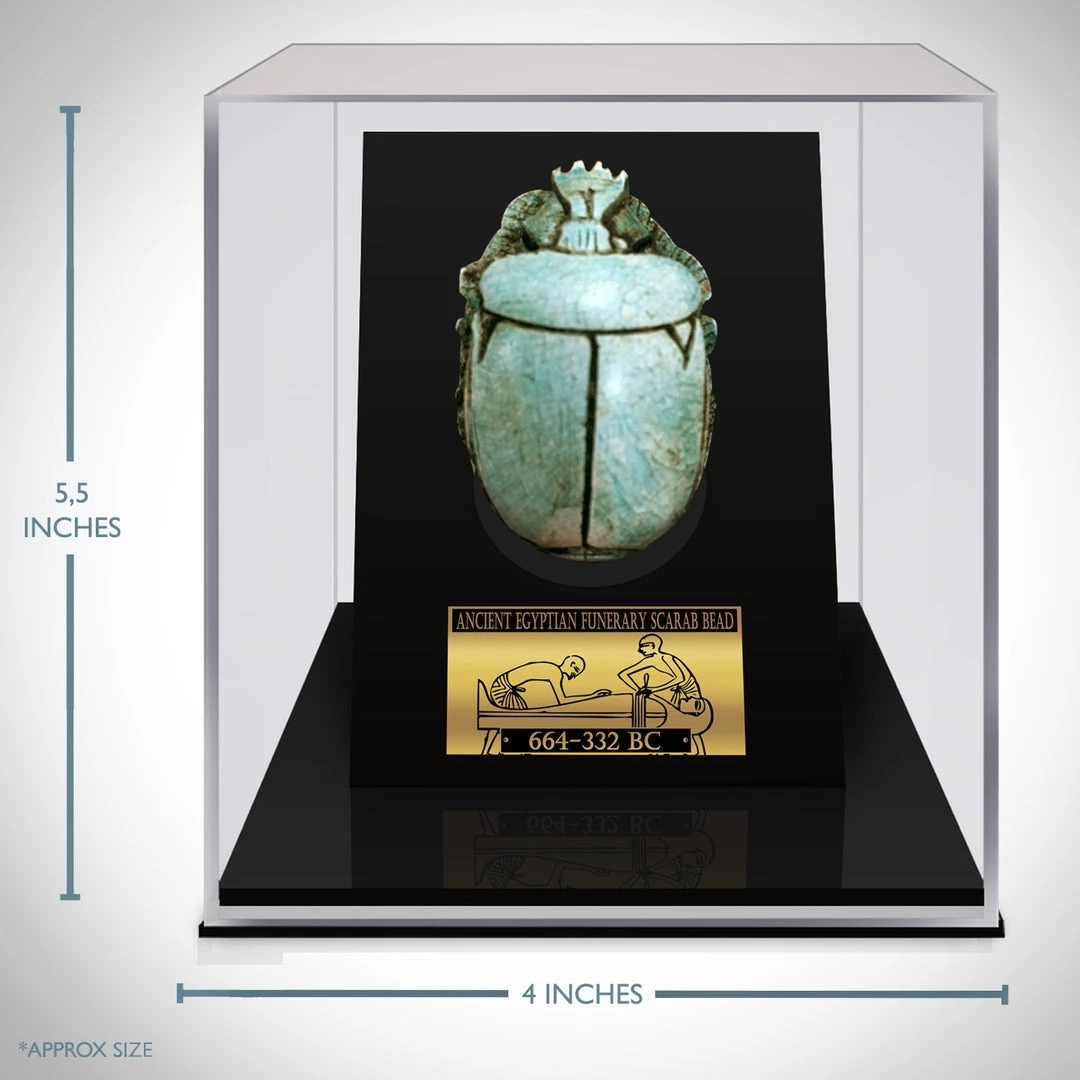 This custom museum display showcases an Authentic, Huge XL Glazed Steatite Funerary Scarab Bead dating from 664-332 BC, part of the Late Period Dynasty. Symbolizing self-creation or rebirth, these funerary scarabs are relatively large scarabs (typically 4 cm to 7 cm long) made from a wide variety of hardstones and faience and are distinguished from other scarabs by having naturalistic, carved “3D” bases, which often also include an integral suspension loop running widthways.