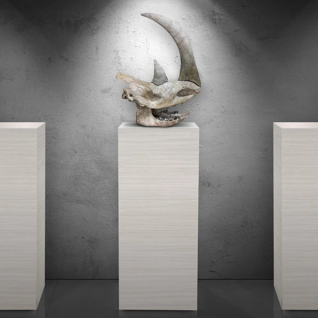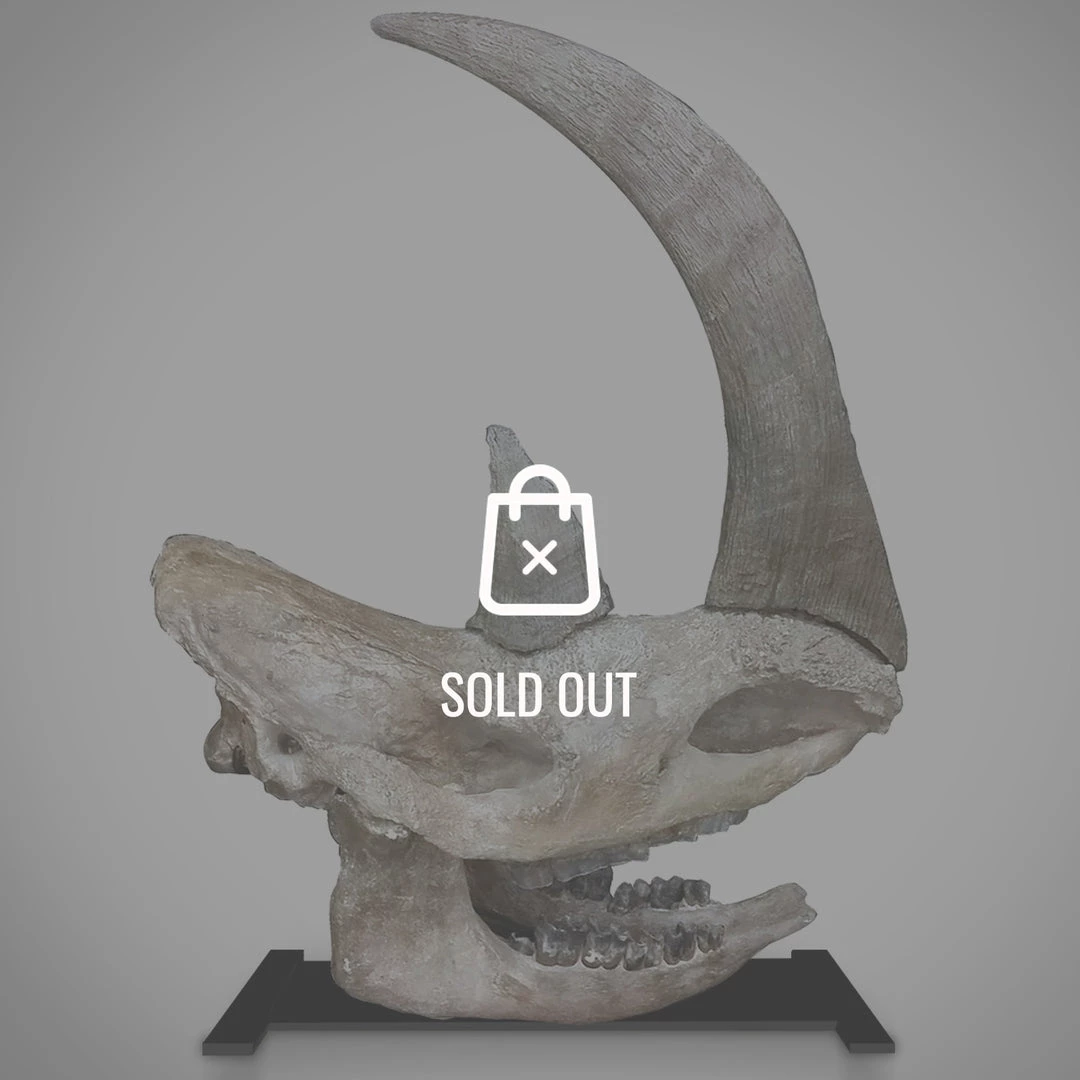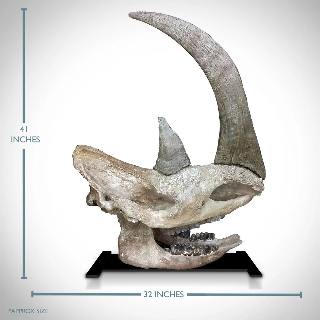 This skull is ~41″ tall and ~32″ long and the horns are museum-grade casts. Unique and one-of-a-kind, you’ll receive the exact piece shown in the photos. It comes with a custom stand ready to be set up and displayed and it’s the perfect addition to your prestigious and unique decor. Complete with a certificate of authenticity, this crown jewel of any collection is an exciting investment that will only get better with age.