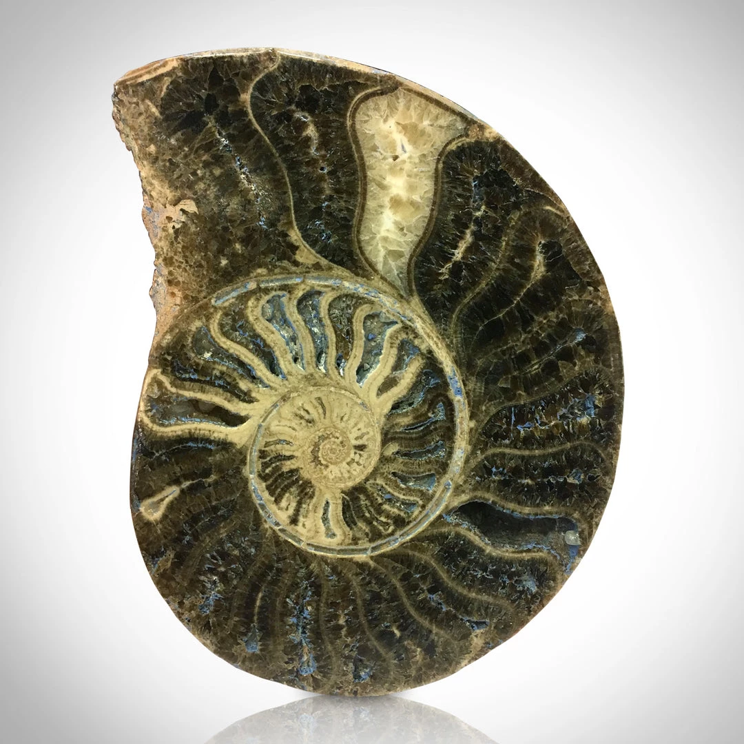 This custom museum display showcases an Authentic Ammonite Shell Fossil which is 66 million years old. Ammonoids are an extinct group of marine mollusc animals in the subclass Ammonoidea of the class Cephalopoda. These molluscs are more closely related to living coleoids (i.e., octopuses, squid, and cuttlefish) than they are to shelled nautiloids such as the living Nautilusspecies. The earliest ammonites appear during the Devonian, and the last species died out during the Cretaceous–Paleogene extinction event.