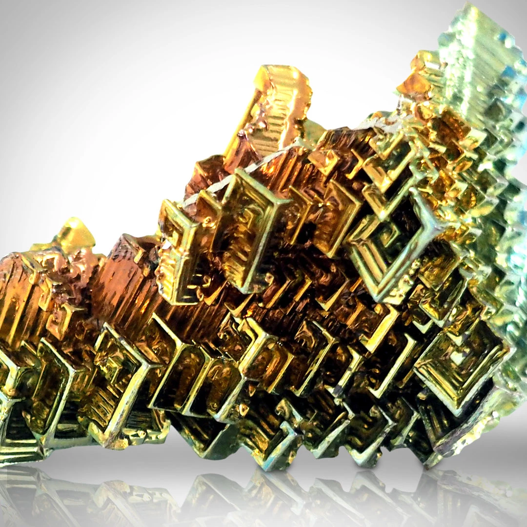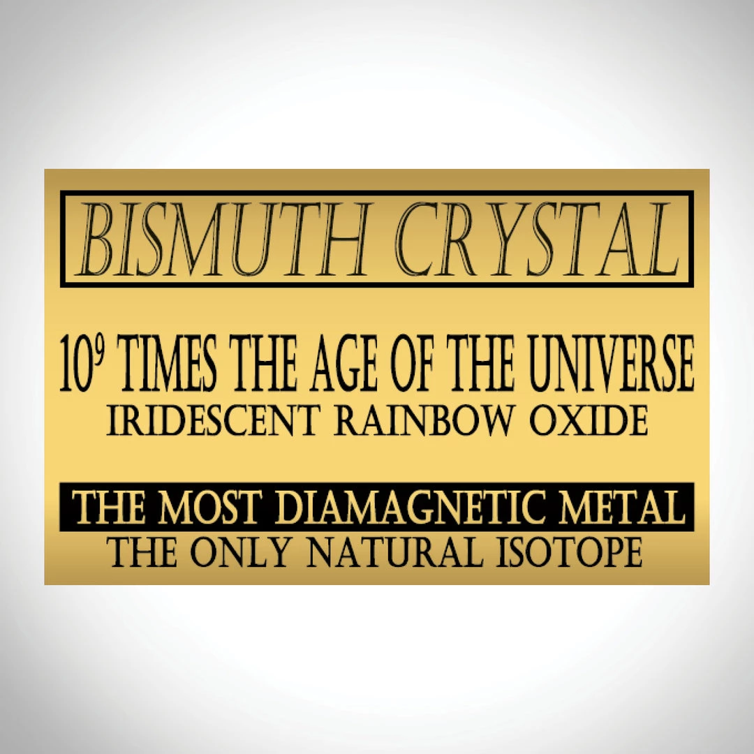 This custom museum display showcases an Authentic Bismuth Crystal, the longest known half-life of any radioisotope – the universe is about 1.38×1010 years old (time from the big bang to the present), the half-life of bismuth (the only naturally-occurring isotope) is approximately a billion (10^9) times the age of the universe.