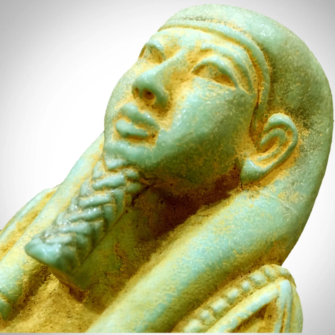 The face is beautifully defined with incised mouth, large almond shaped eyes and faint ears. The arms are crossed on the chest, hands protrude from a shroud to hold a flail in each fist, the right hand also holding a twisted rope connected to an seed sack behind the left shoulder. Horizontal bands of carved hieroglyphic inscriptions cover the lower chest, legs, as well as a vertical band at its back (usually a passage from the Book of the Dead) .