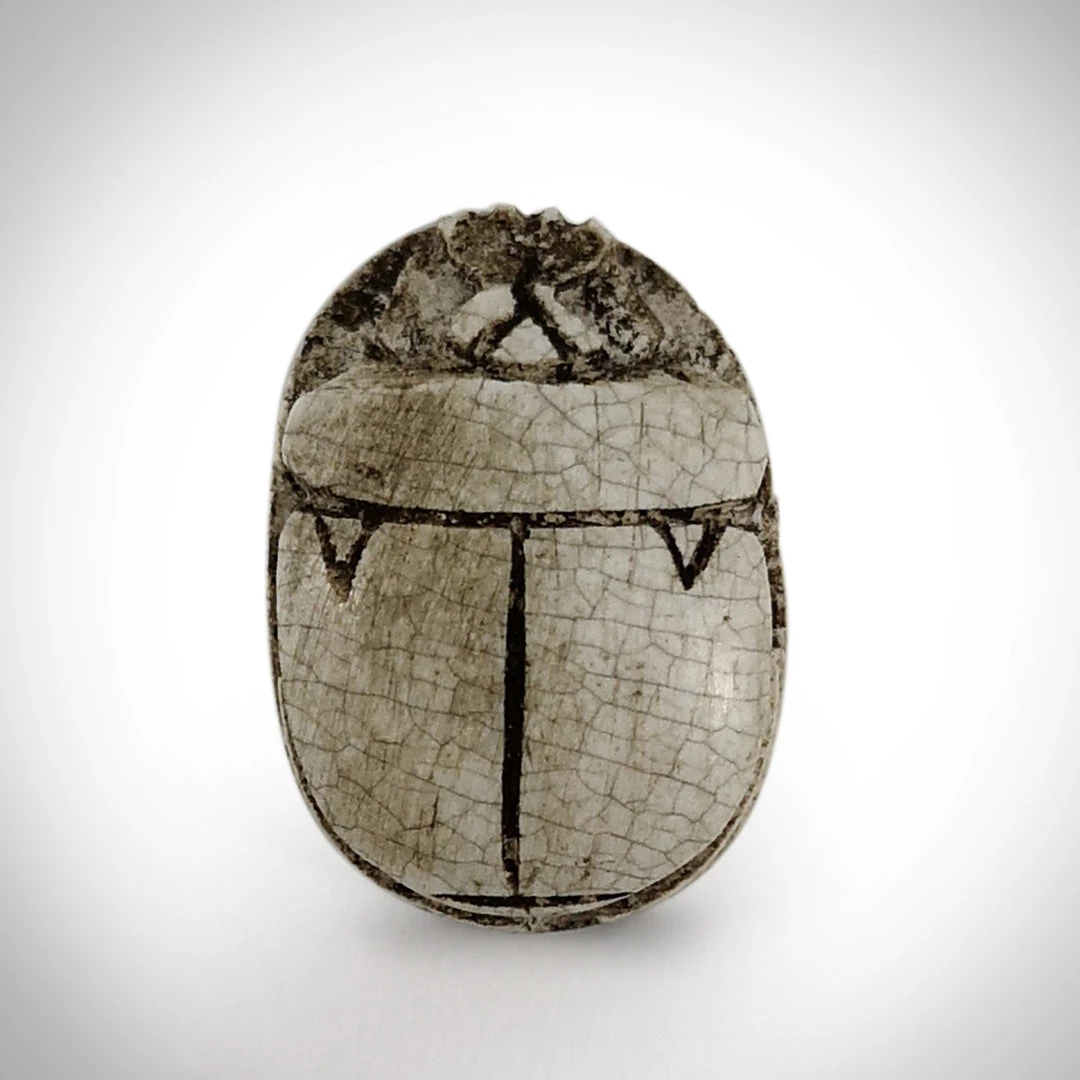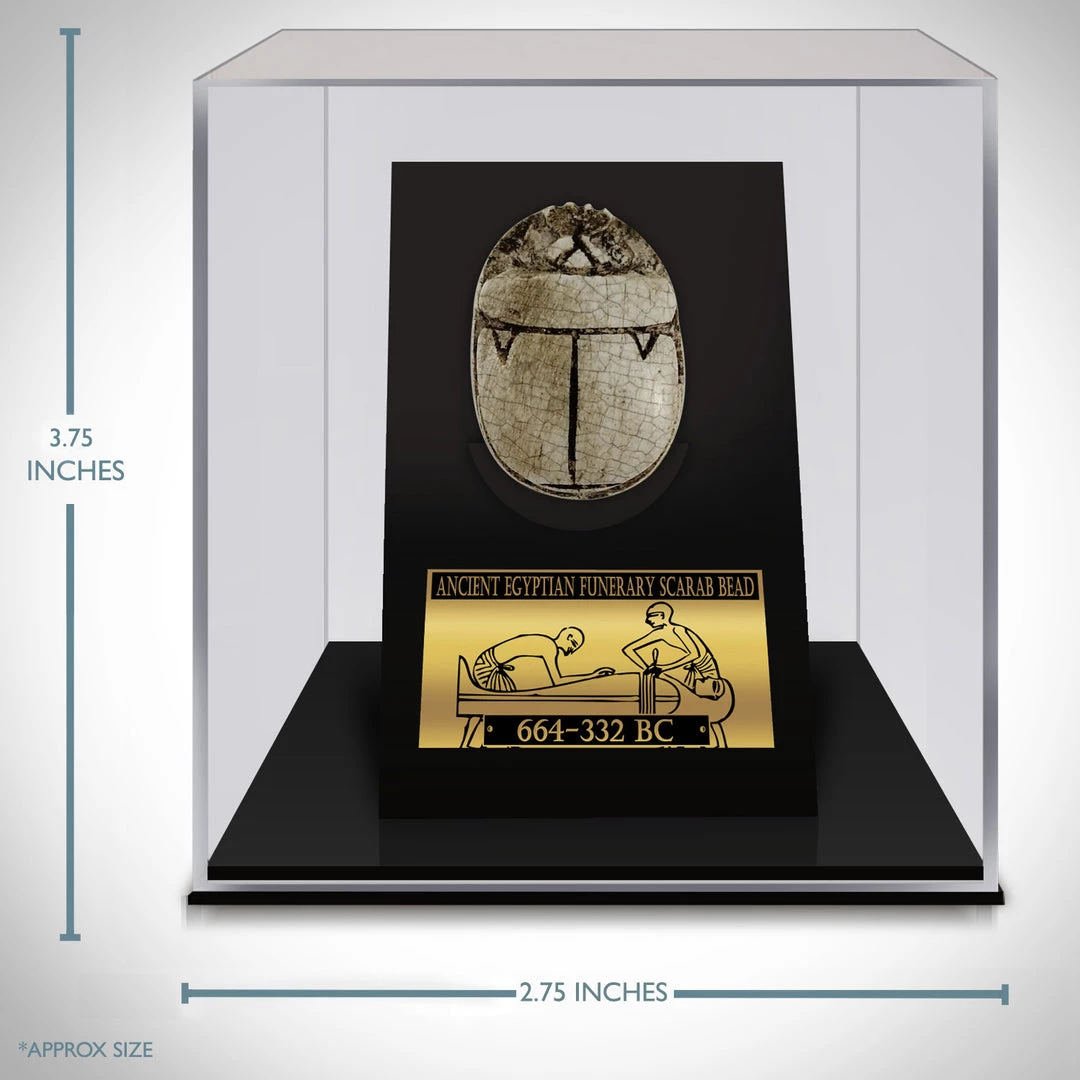 This custom museum display showcases an Authentic White Glazed Steatite Funerary Scarab Bead dating from 664-332 BC, part of the Late Period Dynasty. Symbolizing self-creation or rebirth, funerary scarabs are relatively small scarabs (typically 2 cm to 3 cm long) made from a wide variety of hardstones and faience (Blue being more conventional, thus making this white glazed example an extremely rare specimen) and are distinguished from other scarabs by having naturalistic, carved “3D” bases, which often also include an integral suspension loop running widthways.
