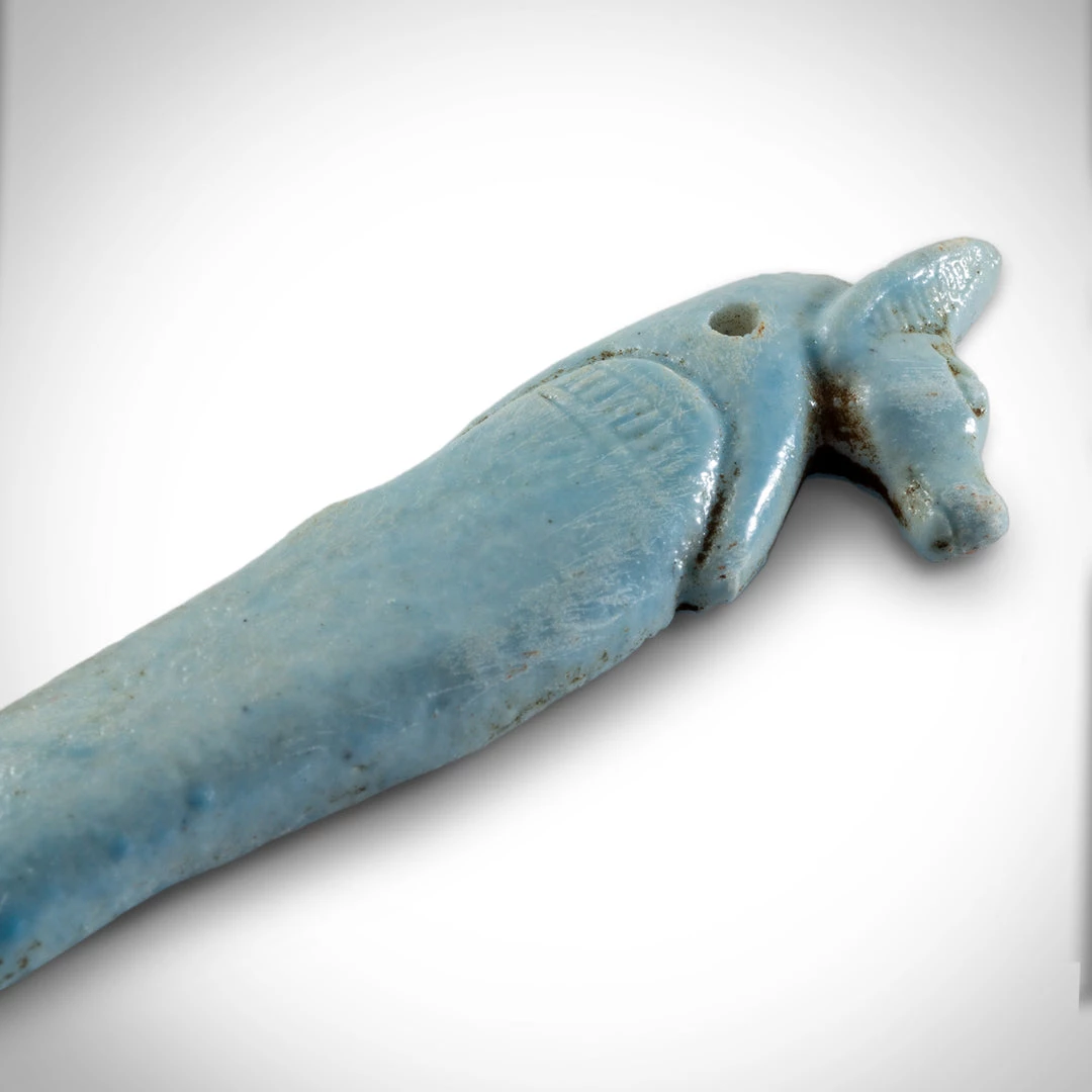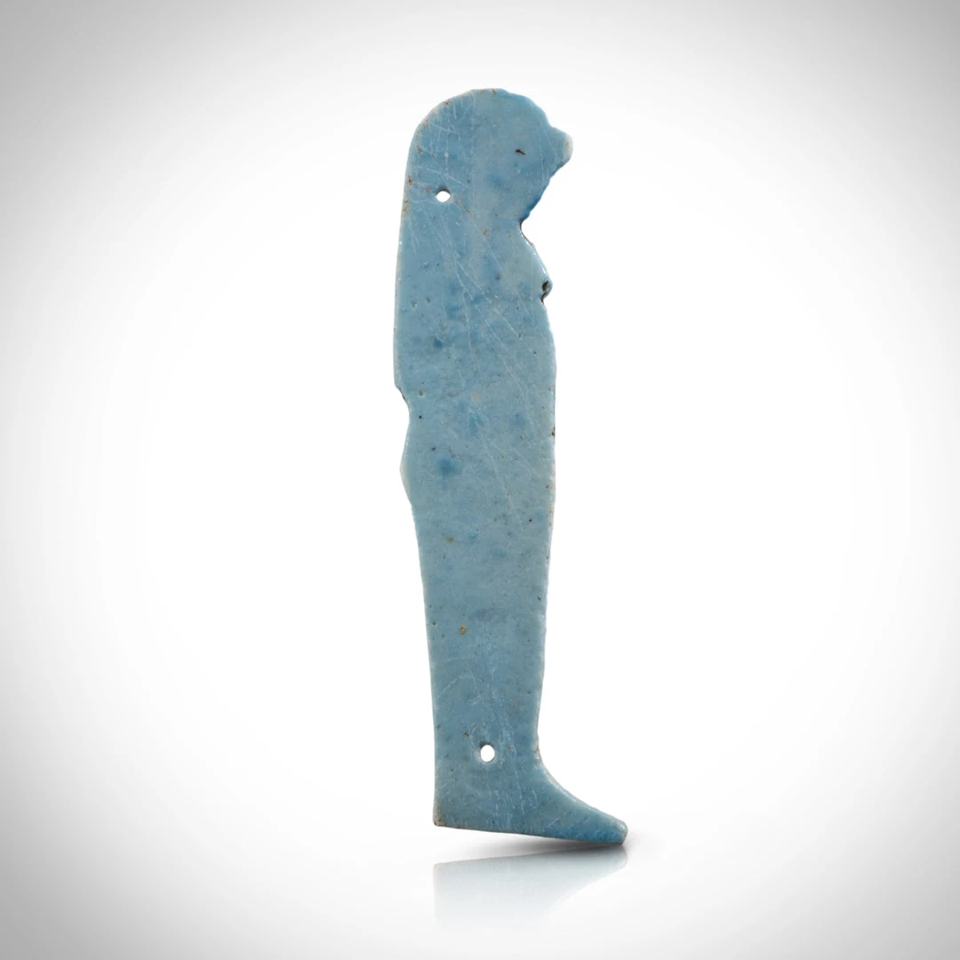 Pierced for attachment – Nets made of beadwork became a luxury fashionable feature of mummy wrappings in the Late Period. Amulets formed part of the beadwork pattern and served to protect the mummy through their magical properties. These Sons of Horus statues are finer examples of such amulets.