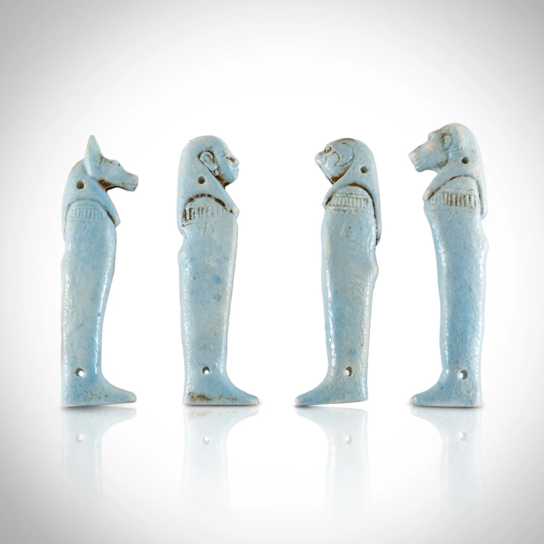 This custom museum display showcases an absolute masterpiece, an Authentic Complete Set of 4 Faience ‘Sons of Horus’ Amulets dating from The Ptolemaic Period 332–30 B.C.