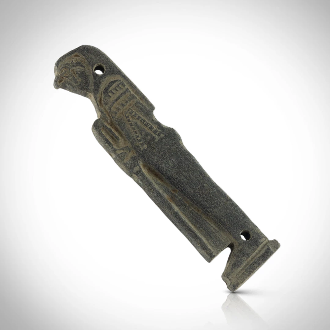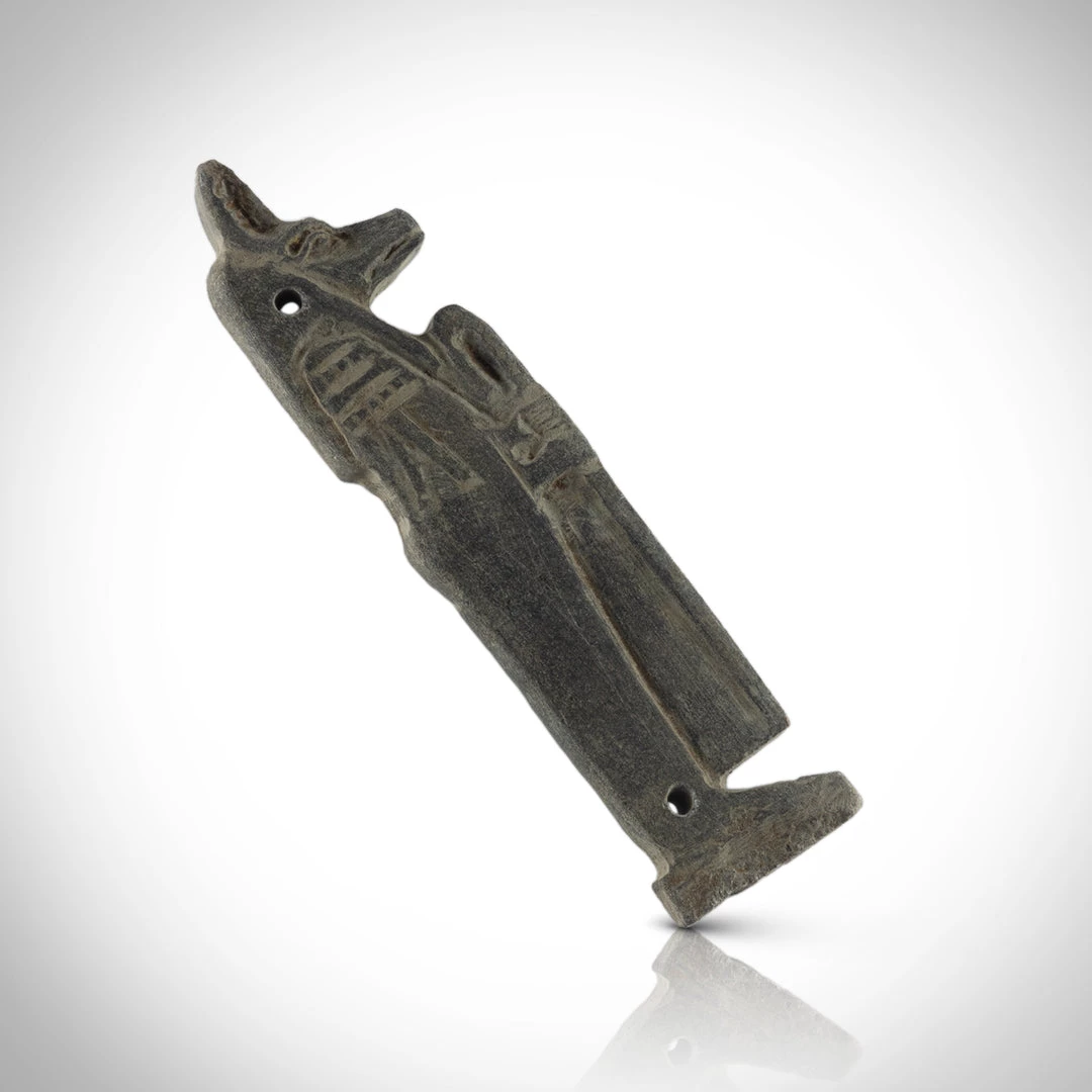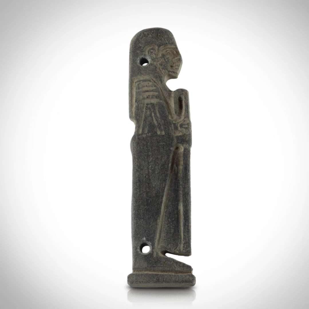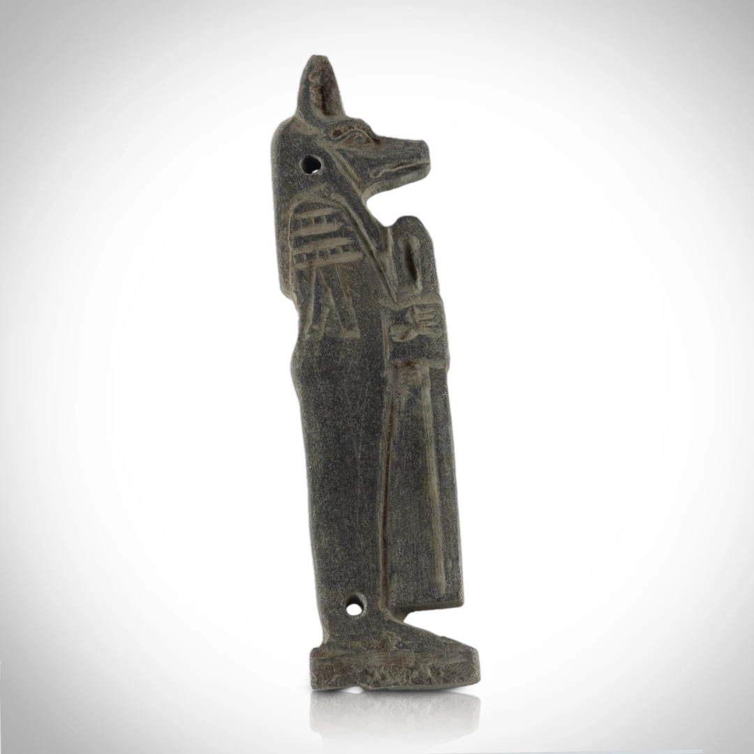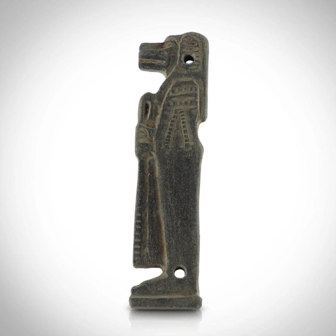 Pierced for attachment – Nets made of beadwork became a luxury fashionable feature of mummy wrappings in the late period. amulets formed part of the beadwork pattern and served to protect the mummy through their magical properties. These Sons of Horus statues are finer examples of such amulets.