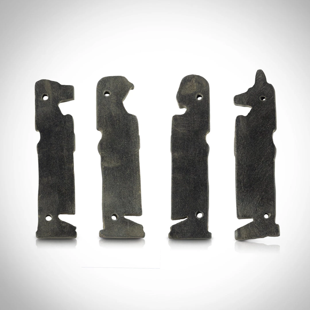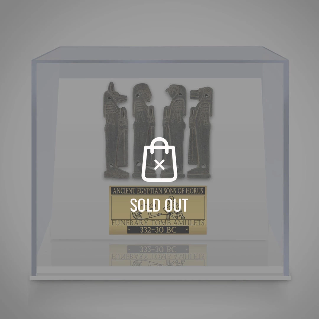 This Custom Museum Display showcases an absolute Masterpiece: an Authentic Complete Set Of 4 Large Carved Sandstone ‘Sons Of Horus’ Amulets, each holding the Sekhem Sceptre – A powerful staff serving gods, kings and high officials. Dating From The Ptolemaic Period 332–30 B.C.