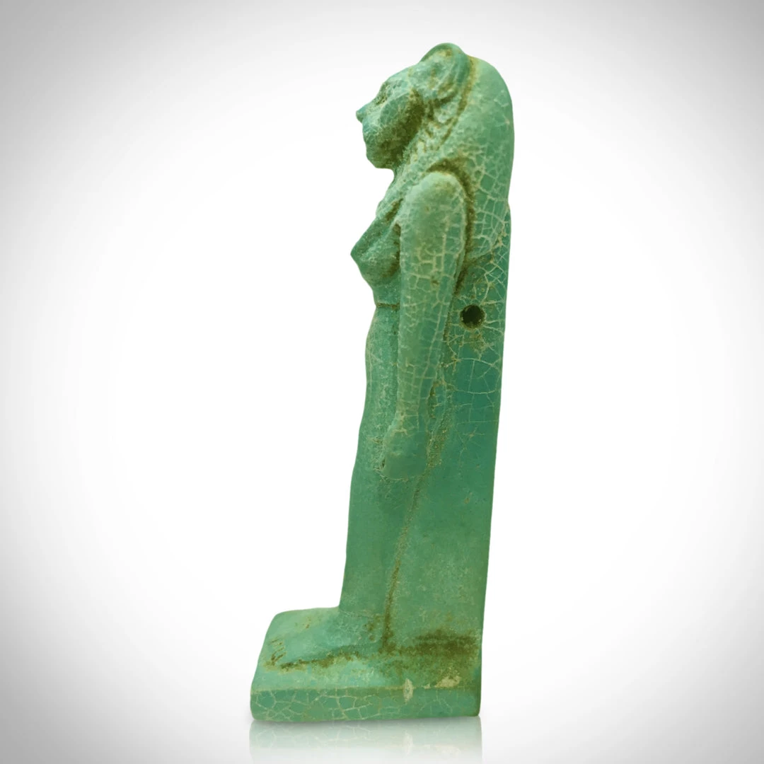 This custom museum display showcases an Authentic Egyptian Warrior Goddess Sekhmet Statue dating from the Ptolemaic Period 332–30 B.C. This ancient Egyptian tomb statue features a beautifully carved Sekhmet statue, depicted here as a human with a lion head, with a long tripartite wig and broad collar necklace. Sekhmet was associated with destruction. According to myth, she was the fiery eye of Ra, which he sent against his enemies – As the cobra on the brow of the king, rearing to protect him. Her name means ‘she who is powerful’. She is commonly represented as a lioness-headed woman because the Egyptians observed that it is the female lion who is the hunter.