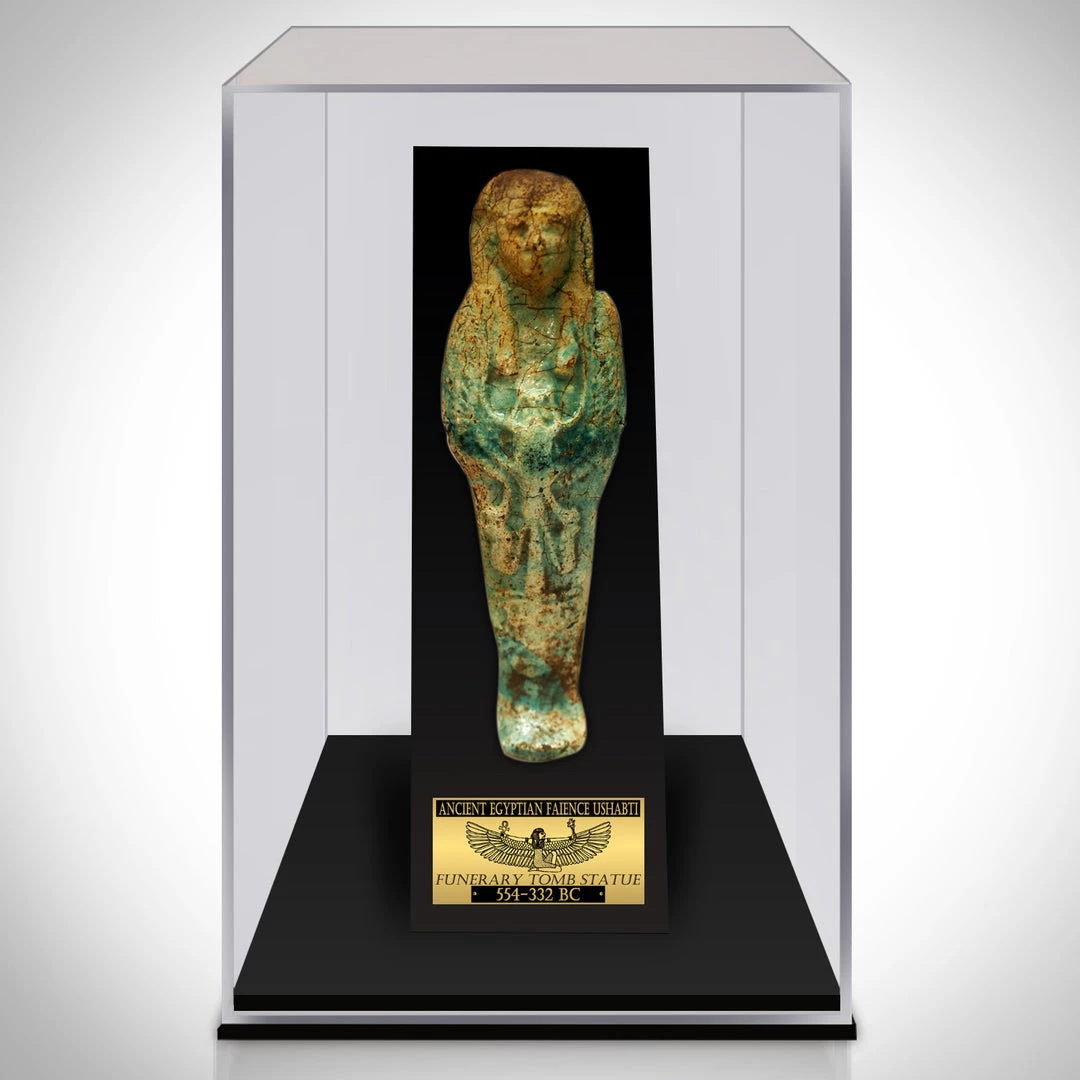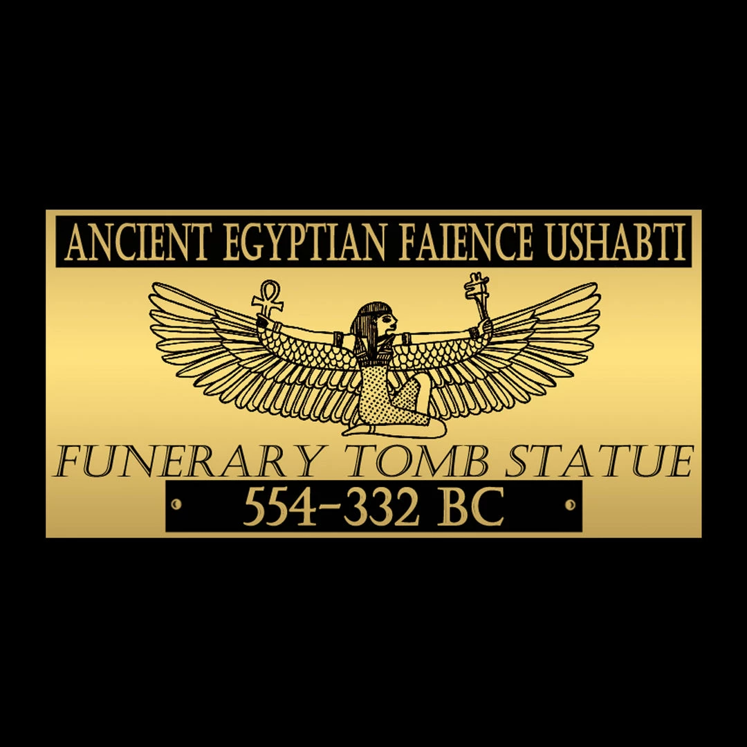 You may elect to proudly display your Egyptian Ushabti Tomb Statue under plexiglass in a custom museum display to keep it looking pristine, ensuring protection of your investment while allowing you to fully appreciate this piece of collectible ancient history. The customized descriptive metallic plaque, in addition to the detailed finishing, add to the elegant and sophisticated, gallery-quality aesthetic. Complete with a certificate of authenticity, this piece is an exciting investment that will only get better with age.