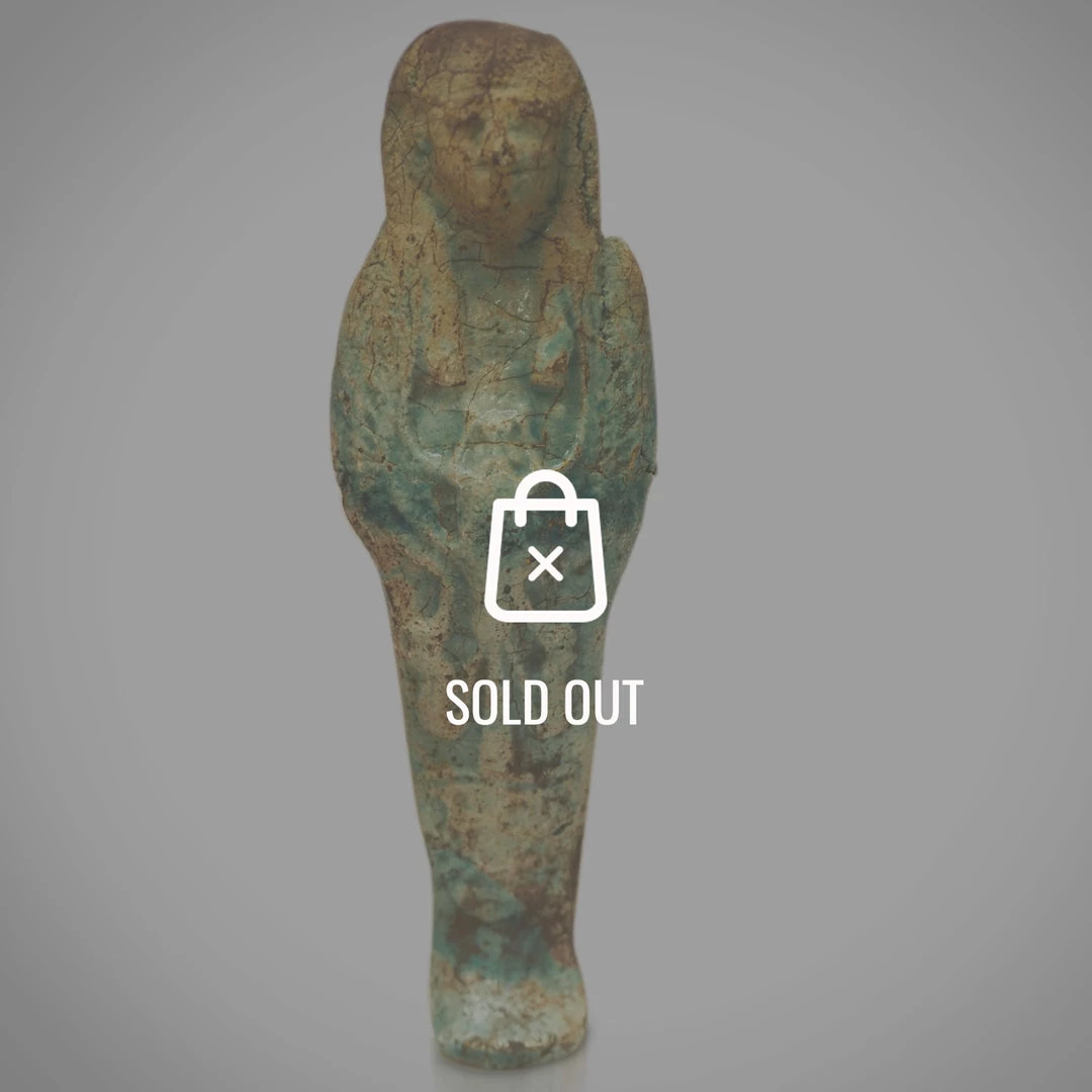 Own a piece of history with this Authentic Faience Glazed Scarab Chest Ushabti Tomb Statue dating from 554-332 BC, part of the Late Dynasty Period. This ancient Egyptian tomb statue features a good blue glazed faience ushabti, finely moulded in mummiform, wearing a tripartite wig.
