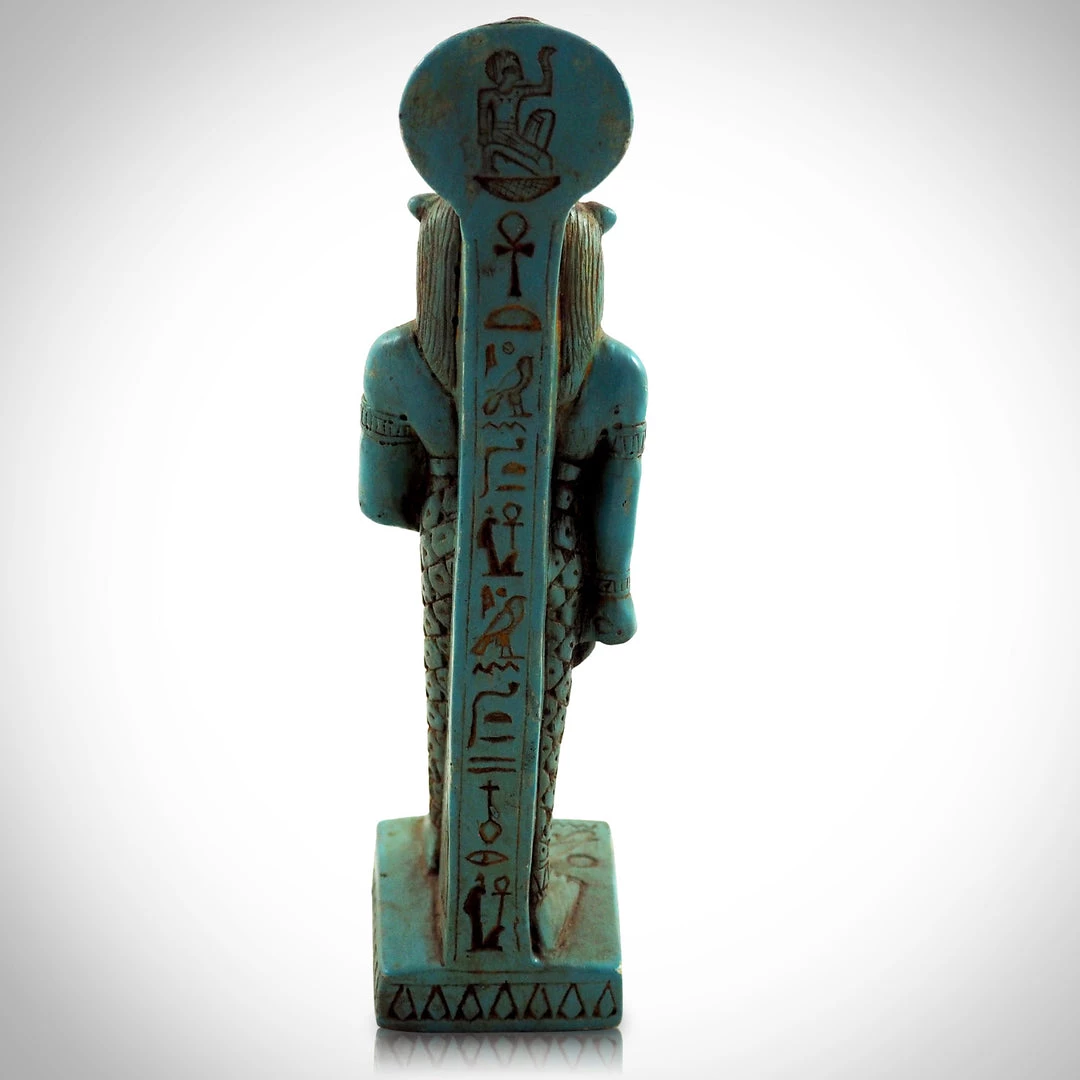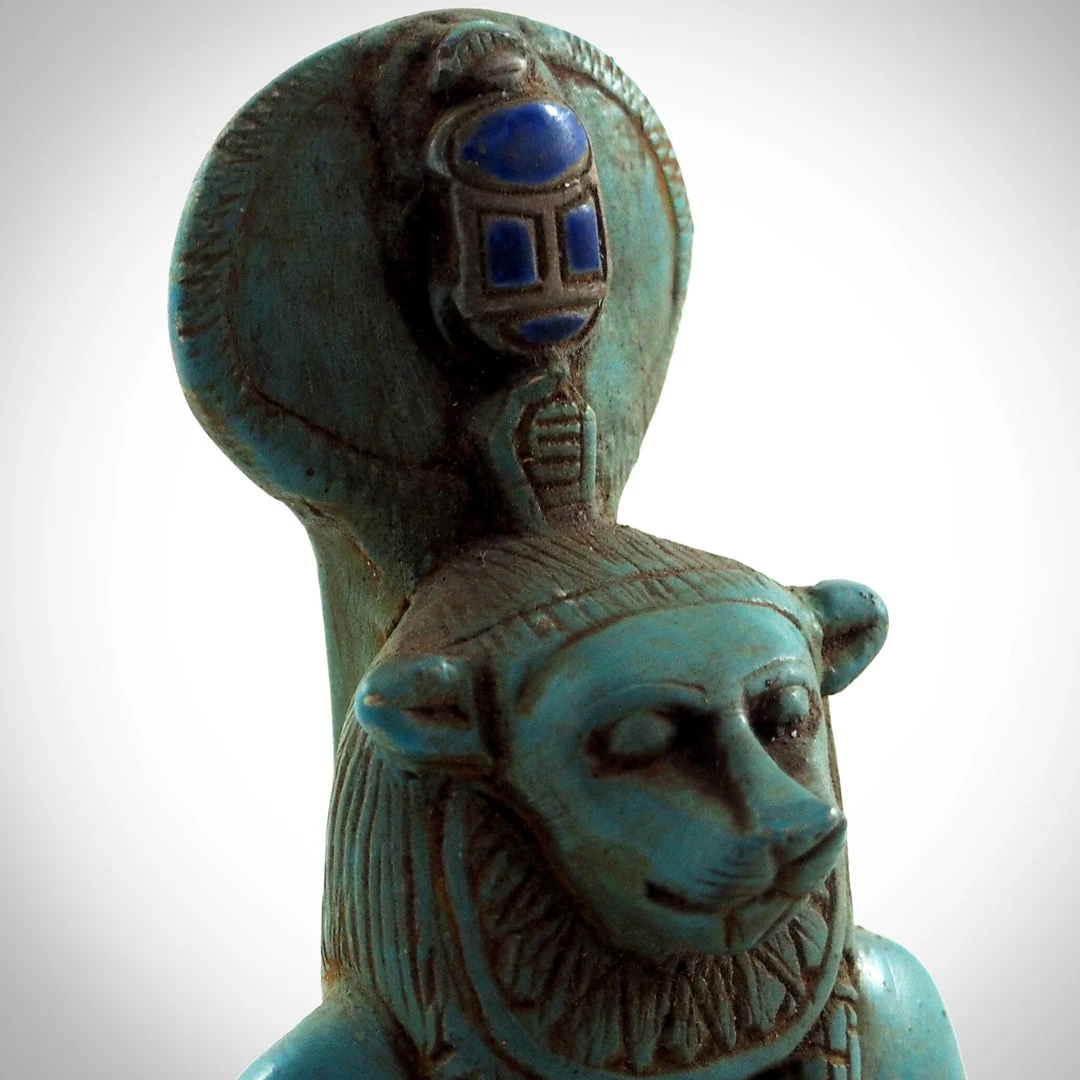 Sekhmet was associated with destruction. According to myth, she was the fiery eye of Ra, which he sent against his enemies – As the cobra on the brow of the king, rearing to protect him. Her name means ‘she who is powerful’. She is commonly represented as a lioness-headed woman because the Egyptians observed that it is the female lion who is the hunter.