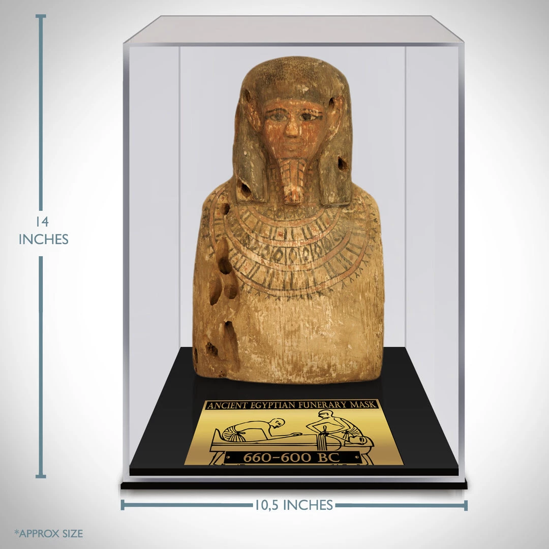 This custom museum display showcases an absolute masterpiece, an Authentic Funerary Mask dating from 660-600 BC, part of the 26th Dynasty. In Ancient Egypt, masks were primarily used for two purposes: as death masks and as ritual masks. Ancient Egyptians believed that it is very important to preserve a body of the dead because the soul has to have a place where to dwell after the death. Preservation of the dead body was done by mummification – a process that involved removing of the internal organs and placing it in canopic jars, wrapping body in linen and embalming. It was also considered very important for the soul to be able to recognize the body so it can return to it.