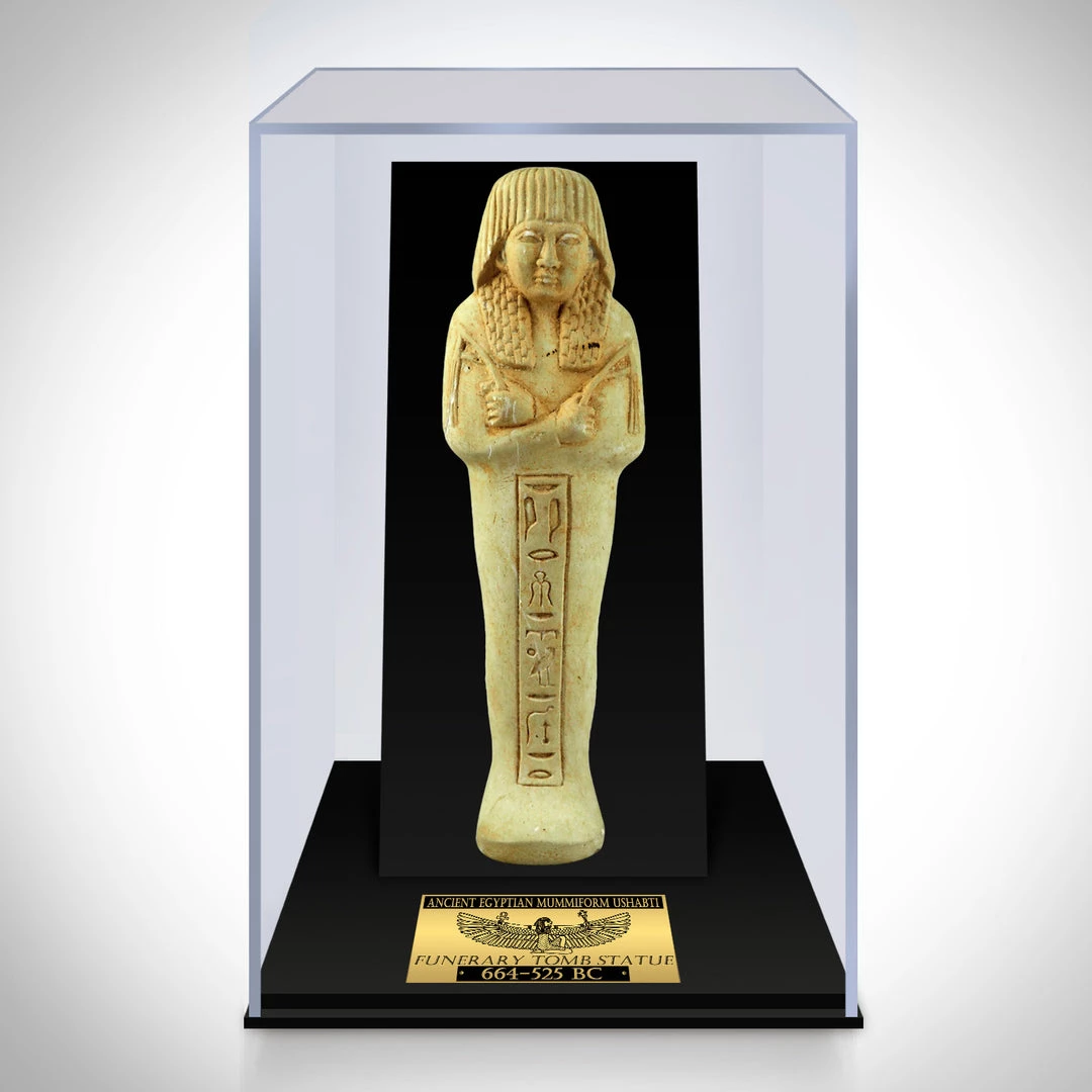 This custom museum display showcases an absolute masterpiece, an Authentic Carved Sandstone Tomb Statue dating from 664-525 BC, part of the 26th Dynasty. This ancient Egyptian statue was finely carved in mummiform, wearing a tripartite wig and broad collar necklace. The head is also beautifully defined. The arms are crossed on the chest, hands protrude from a shroud to hold a flail or flabellum (nekhakha) – the most prominent items in the royal regalia of ancient Egypt. A vertical band of carved hieroglyphic inscriptions cover the lower chest and legs (usually a passage from the Book of the Dead).