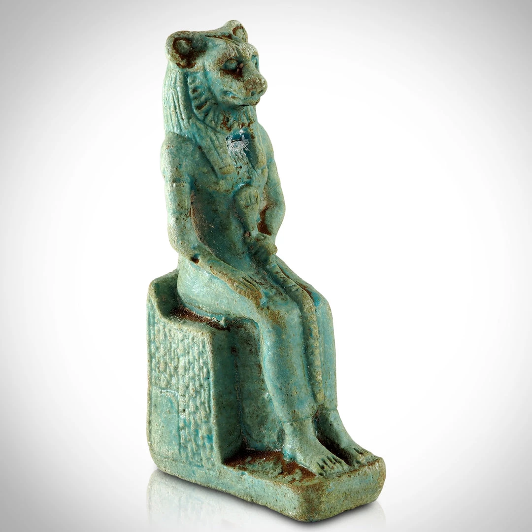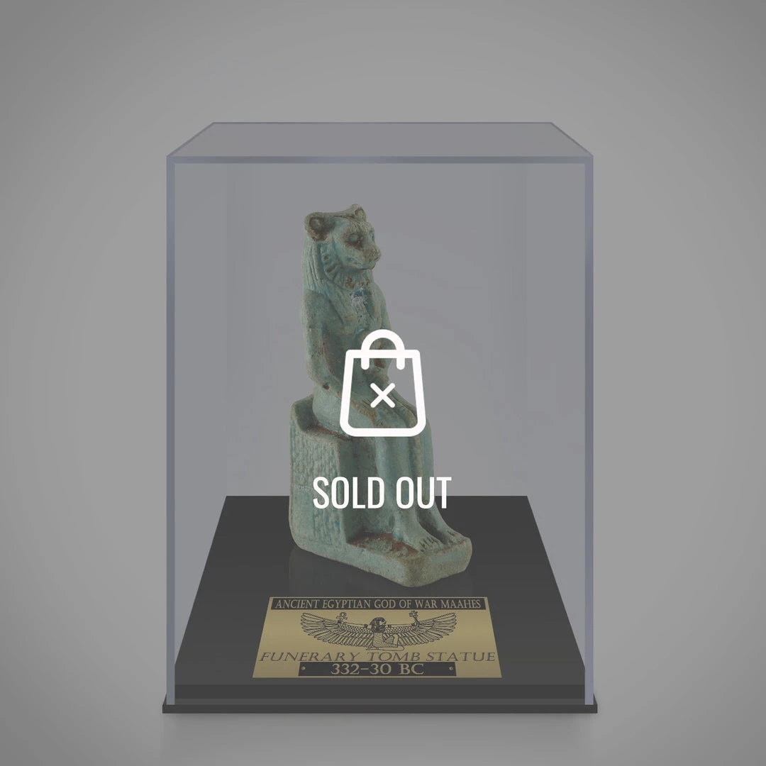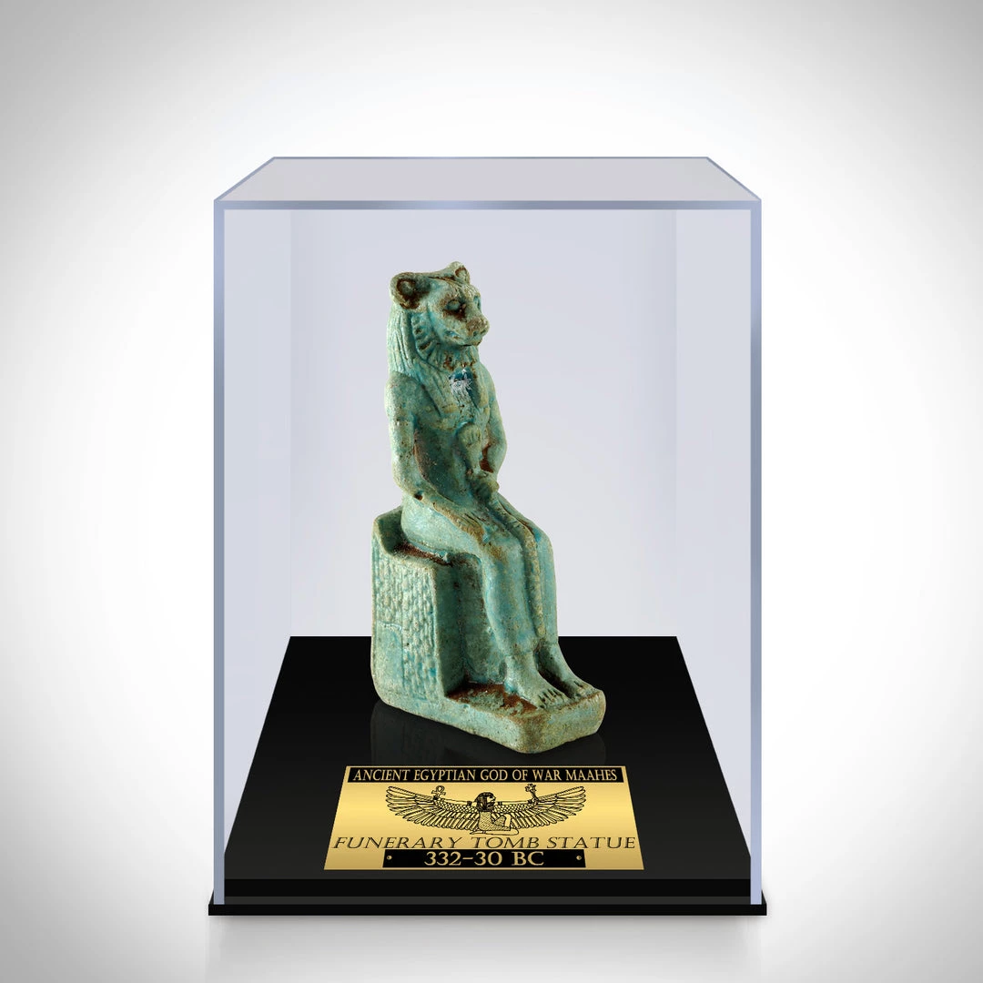 This custom museum display showcases an absolute masterpiece- an Authentic Egyptian God of War Maahes statue dating from the Ptolemaic Period 332–30 B.C. This ancient Egyptian tomb statue features a beautiful Faience pottery Maahes statue, depicted here as a human with a lion head, with a long tripartite wig, broad collar necklace, holding the he sekhem sceptre – A powerful staff serving gods, kings and high officials