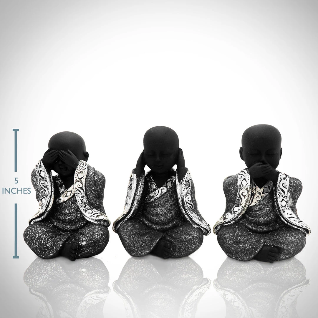 Decorate your business, home, or office with this set of 3 Handmade and painted ‘See No Evil, Hear No Evil, Say No Evil ‘ resin Buddha statues. This piece of folk art at its best is elegantly highlighted with silvered details and adorned with glass jewels and has a great antique patina just the way we like’em! The used-and-abused vintage finish makes it the perfect addition to your unique decor. It’s a must for any man-cave, bar, garage, game room, lady den, – or just as a cool conversation piece in your home or office.