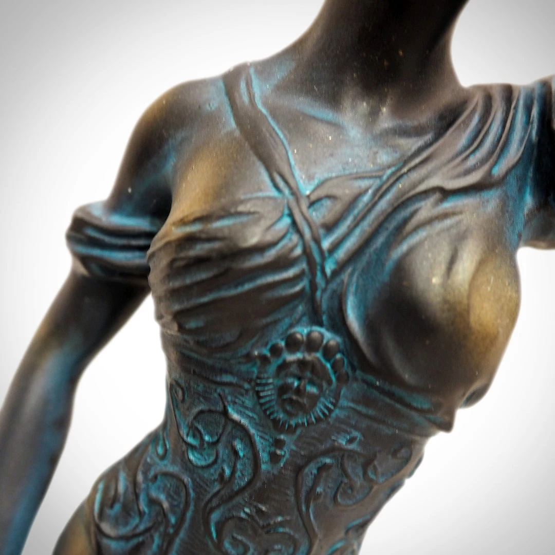 Decorate your room, business, home or office with this Hand made and hand painted ‘Lady Justice’ resin statue. Comes complete with wielding sword and scale. This piece of folk art at its best is elegantly highlighted with antique gold, silver, and aged verdigris patina….just the way we like’em! The used-and-abused vintage finish makes it the perfect addition to your unique decor. It’s a must for any man-cave, bar, garage, game room, lady den, – or just as a cool conversation piece in your home or office.