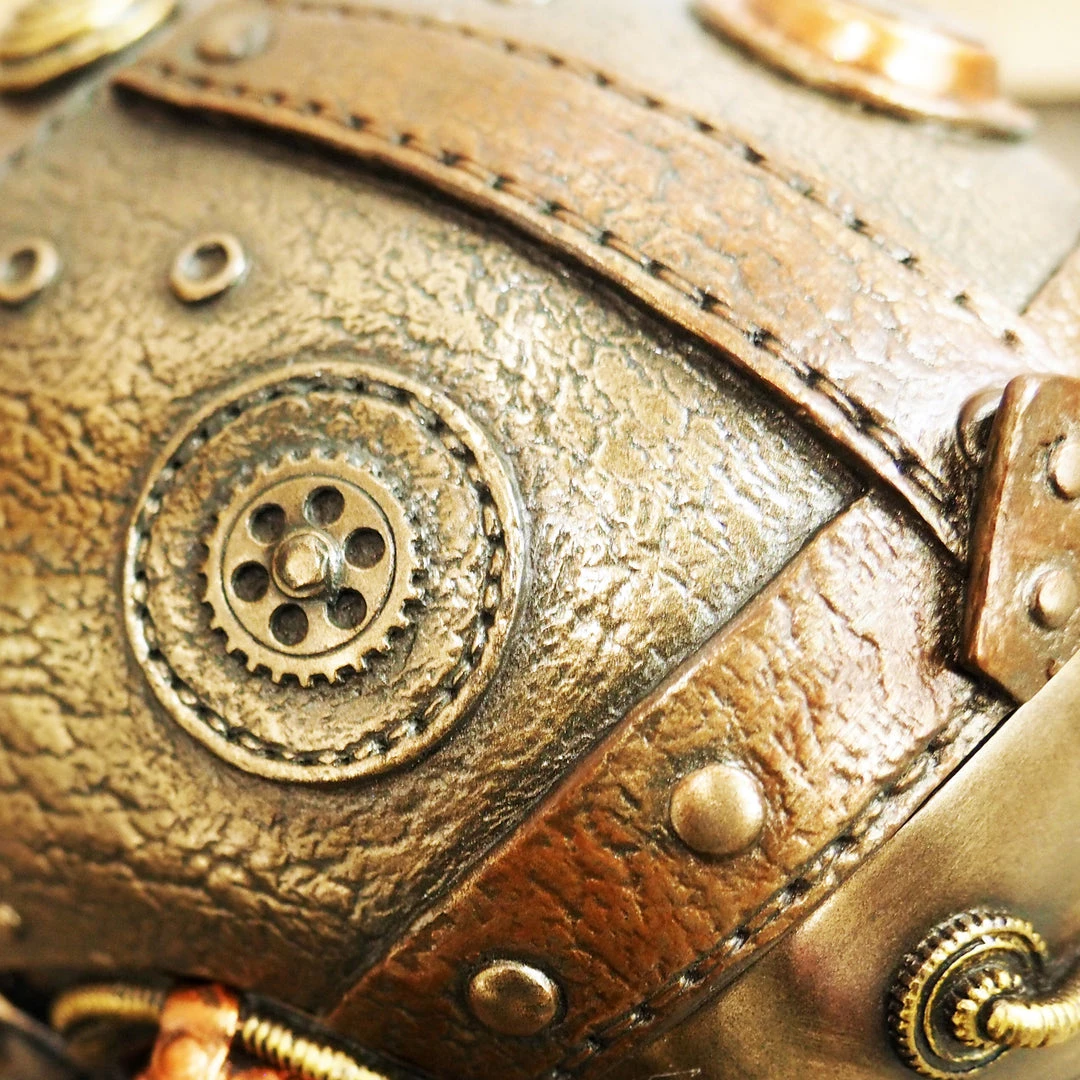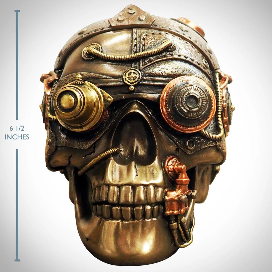 Decorate your room, business, home or office with this Hand made, hand painted and extremely sophisticated ‘Steampunk Skull’ statue. This stunning piece is made of cold cast bronze and leather and also serves as a tray. The special production process of this piece, originated from Great Britain, uses actual bronze powder mixed in the cold cast resin in order to ensures a richer, more life-like presentation.