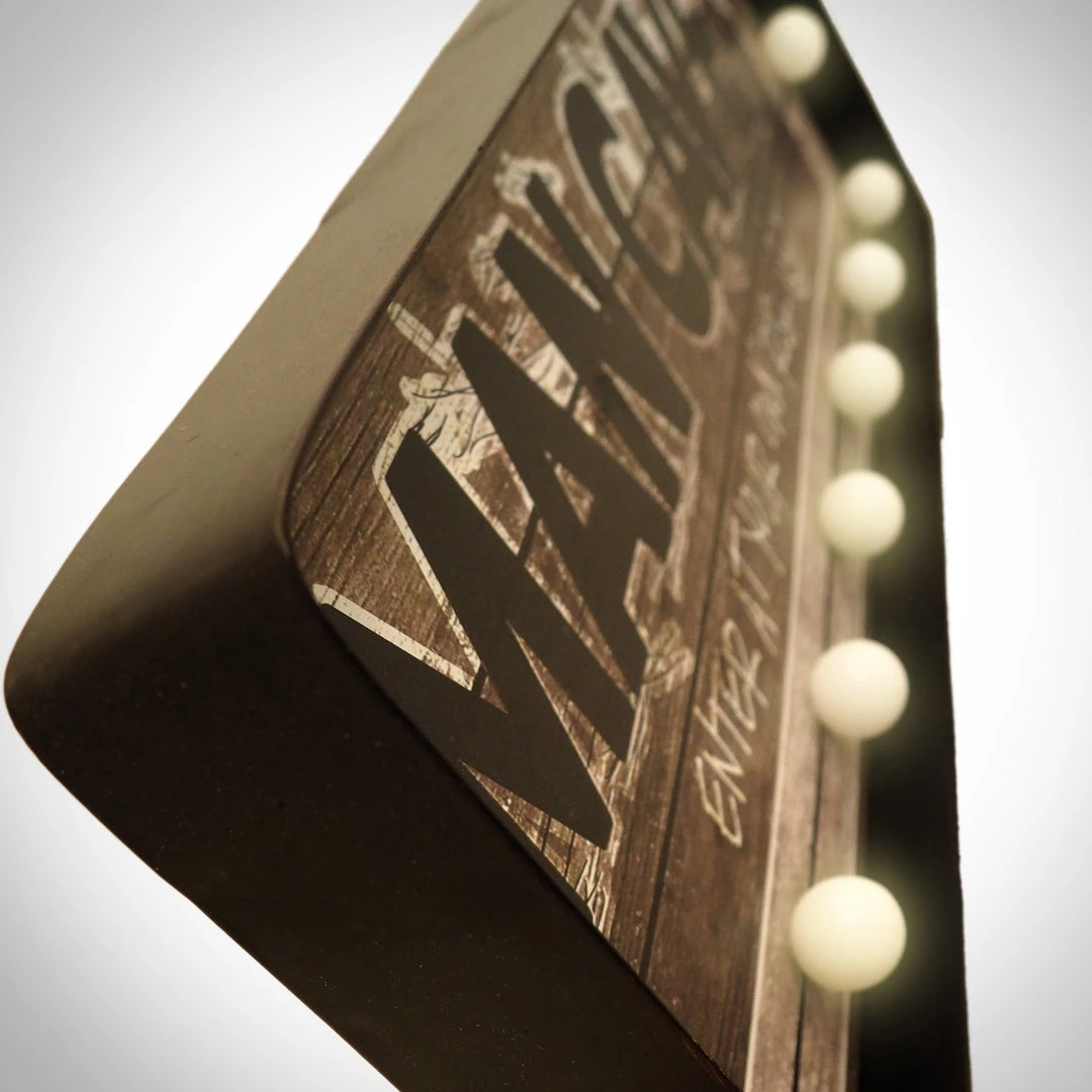 Decorate your room, business, home or office with this stunning 21″ wide ‘Man-cave Marquee – Enter at your own risk’ Tin Lighted Sign. Comes complete with light bulbs. In metal, this piece of folk art at its best has a great vintage patina, just the way we like’em! The used-and-abused vintage finish makes it the perfect addition to your unique decor. It’s a must for any man-cave, bar, garage, game room, lady den, – or just as a cool conversation piece in your home or office.