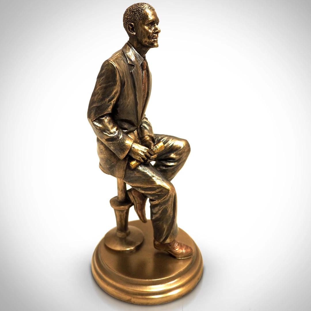 Decorate your room, business, home or office with this Hand made and hand painted President Barack Obama resin statue. This piece of folk art at its best is elegantly highlighted with antique gold patina….just the way we like’em! The used-and-abused vintage finish makes it the perfect addition to your unique decor. It’s a must for any man-cave, bar, garage, game room, lady den, – or just as a cool conversation piece in your home or office.