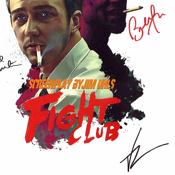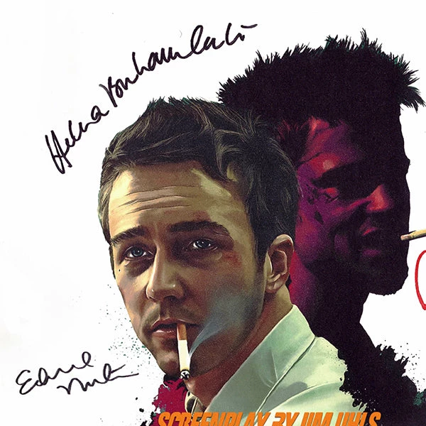 Pay homage to Fight Club , with this 20th Century Fox  fully licensed facsimile of the official signed movie script, originally signed by actors Brad Pitt, Edward Norton & Helena Bonham Carter , of which is strictly limited to 100 units Worldwide and has been approved and numbered accordingly.