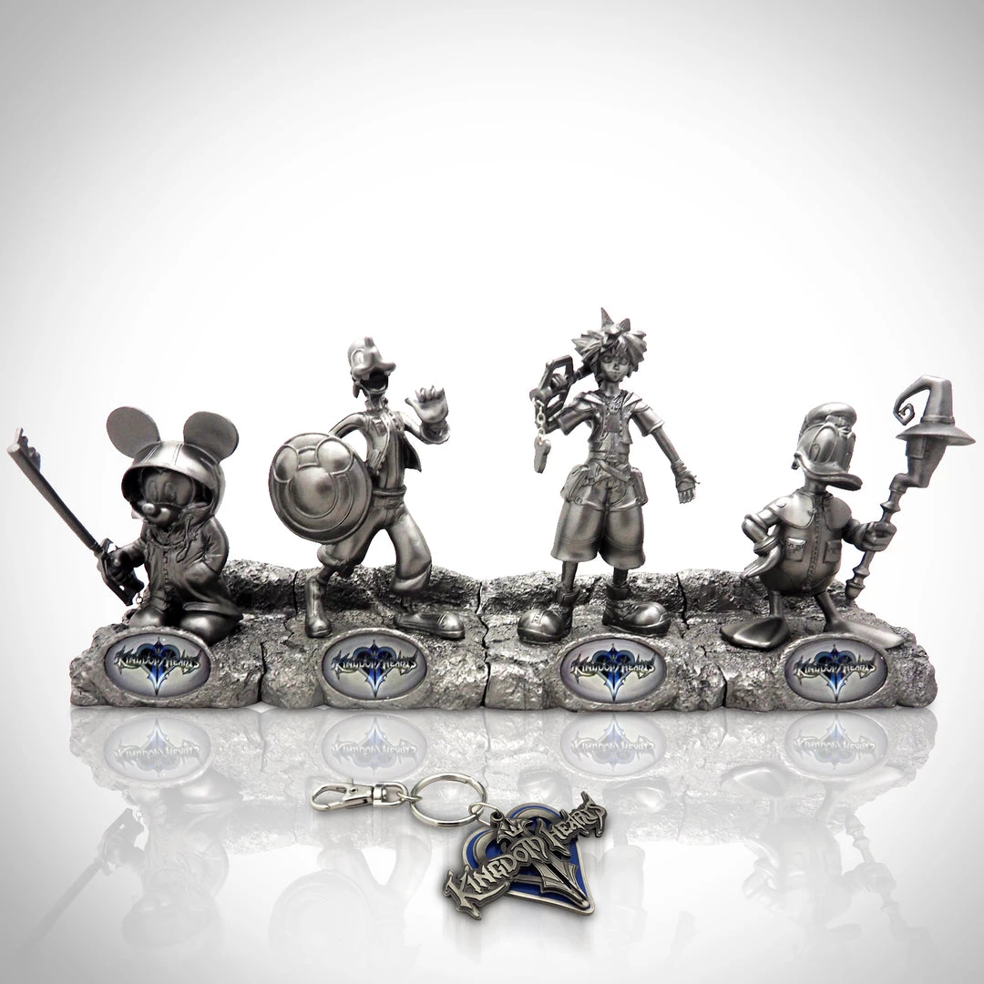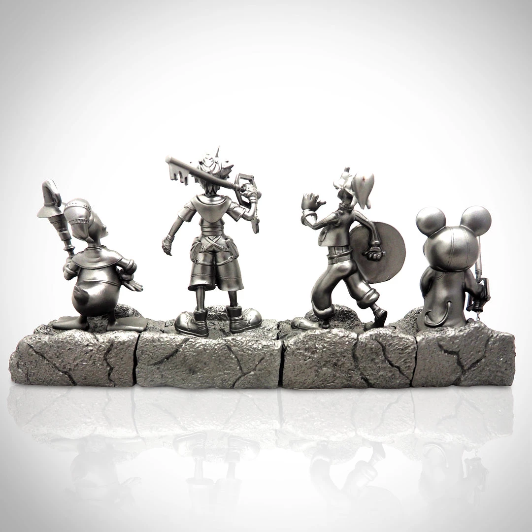 Based on Kingdom Hearts, this amazing faux silver plated boxed Set of 4 vintage statues was only available at San Diego Comic Con 2012. It features 4 great 5+ inch resin sculptures of Mickey, Sora, Goofy and Donald. The figure bases fit together to make a great display. A sold out strictly limited edition of 200 pieces, this is a must have rare collectible for any Disney fan. Decorate your home, business or office, with this incredible piece of entertainment history!