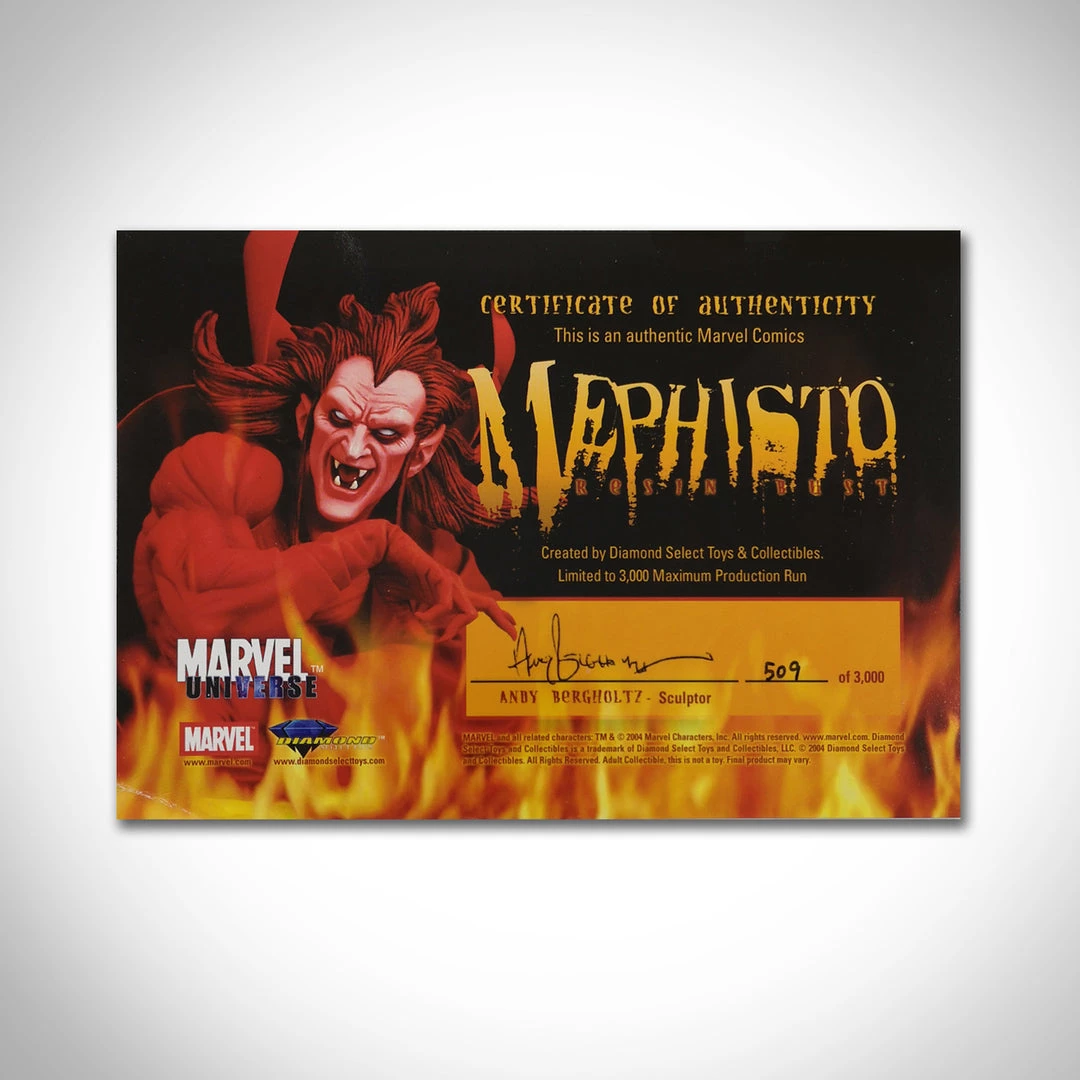 This Vintage 2004 Statue is strictly limited to 3000 units world wide, long sold out. The Mephisto statue was based upon state-of-the-art three-dimensionally scans of the Marvel Studio Archives, combined with high end sculpting and painting, to develop the impeccable detail that this statue features. The result is a fantastic realism.