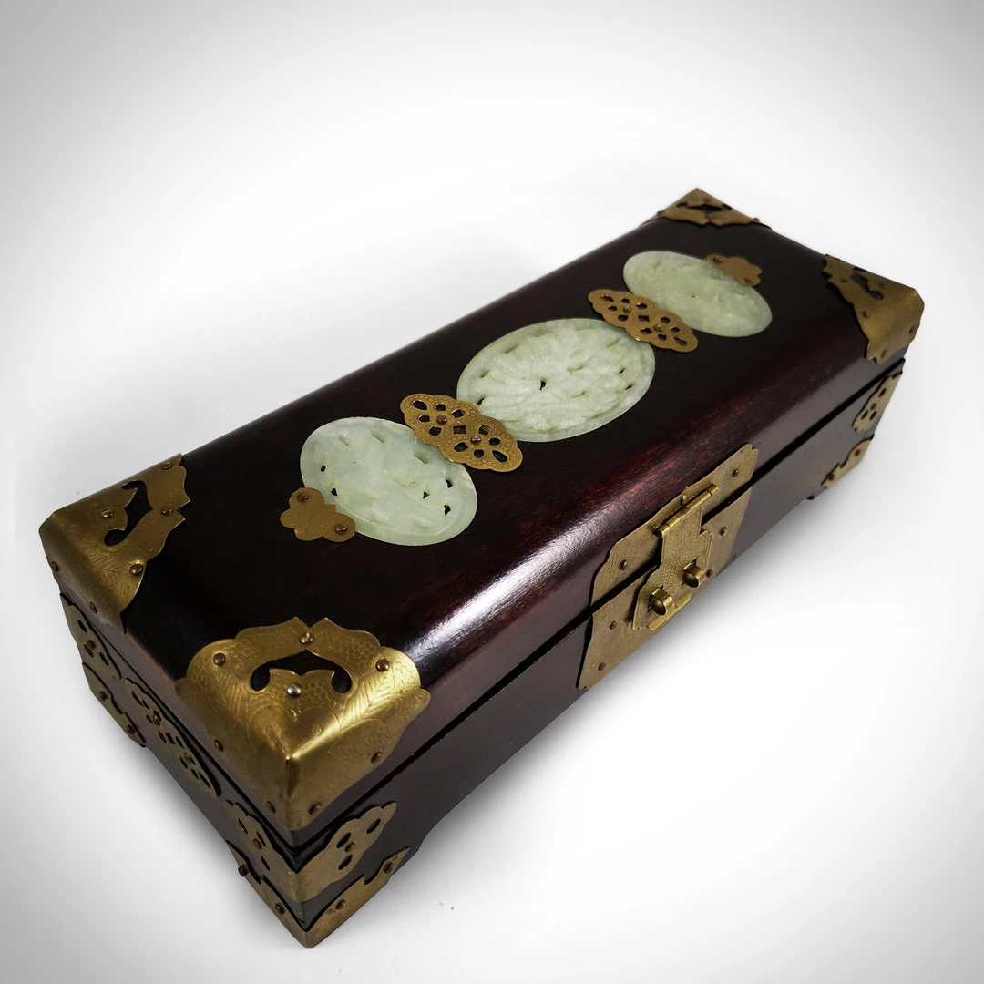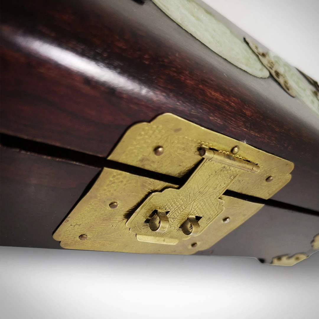 The lid is inlaid with carved Jade green stone which is believed to be Buddha’s tears – Healers say the gemstone also benefits the eyes, hips, heart, spleen and thymus gland as well as aid poor digestion, relieve constipation and promote healthy hair.