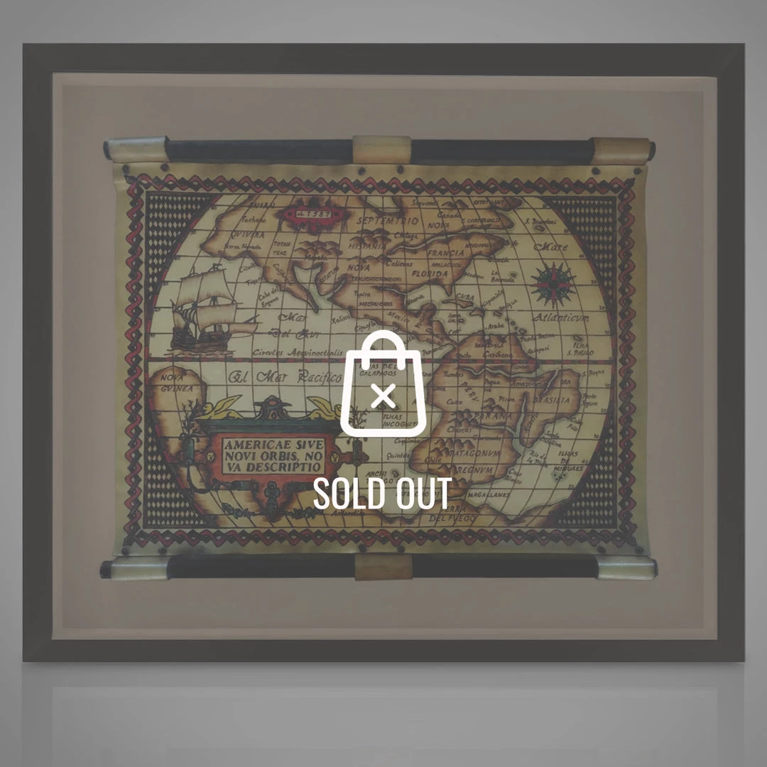 This work of art pays homage to the famous Flemish cartographer and map publisher, Abraham Ortelius, who printed Americae Sive Novi Orbis, Nova Descripto (A New Description of America or the New World.) as a part of his Theatrum Orbus Terrarum, considered the first modern atlas of the known world. The atlas was initially published in 1570, with new editions issued through 1612. The Theatrum was the first atlas released as a collection of uniform sized map sheets with their text printed from specially engraved copper plates. The unique Wooden Handled Scroll Map was entirely hand-tooled and stained on a thick leather hide, and was professionally mounted within a shadow box frame.