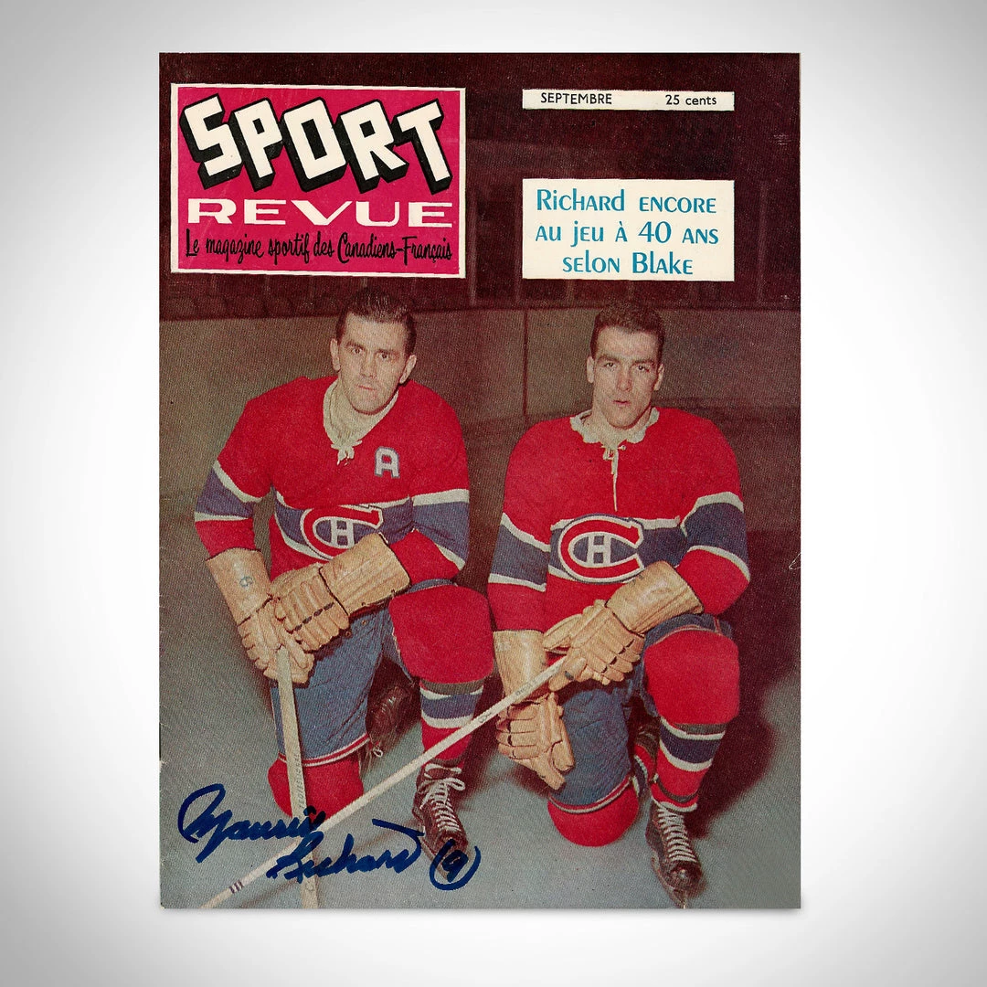 Pay homage to the ‘Rocket’ with this absolute masterpiece, a gallery-framed, Hand-Signed, vintage copy of the SPORT REVUE Magazine from September 1956, featuring on the cover, Maurice ‘The Rocket’ Richard and his brother Henri ‘The Pocket Rocket’ Richard, signed by hockey legend, the late Maurice Richard.