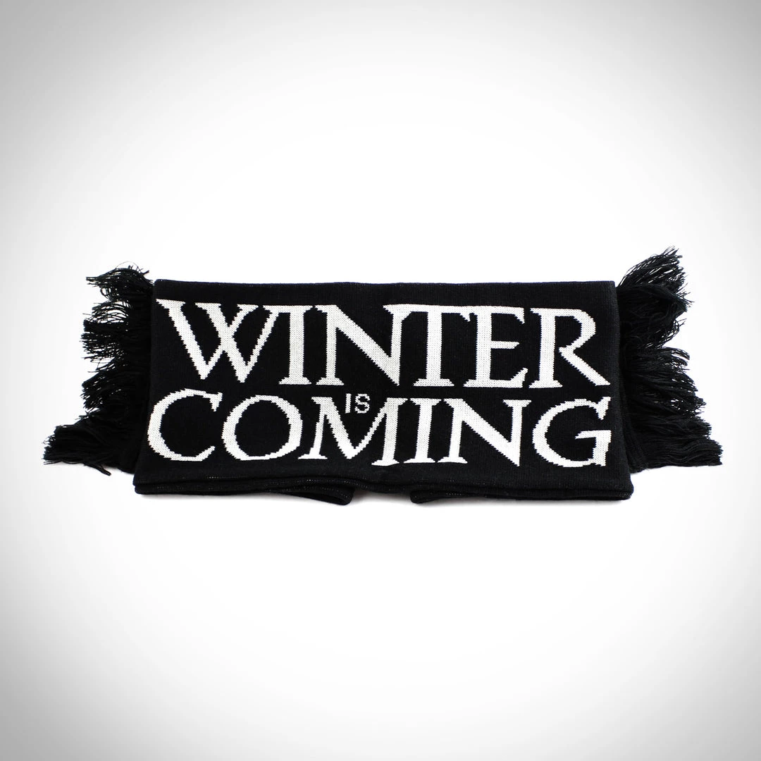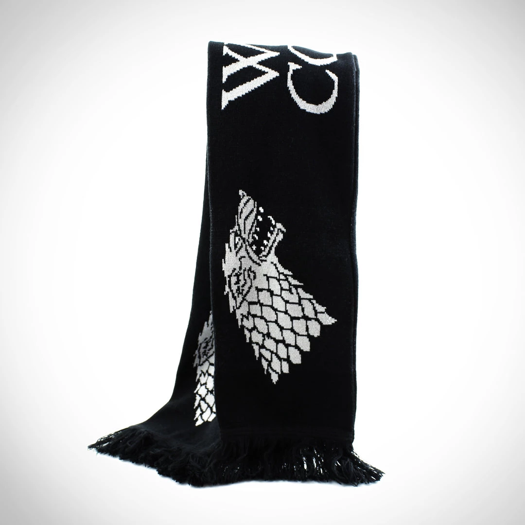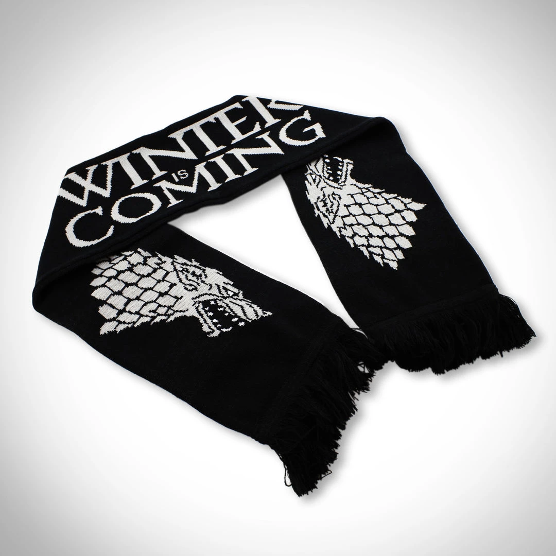 Impress everyone and stay warm while wearing this cool The Game of Thrones Stark Logo ‘Winter Is Coming’ Scarf! Inspired by TV’s The Game of Thrones, this Stark knitted scarf features the House of Stark words “Winter Is Coming” in Black with White, showing the dire wolf from the sigil of the House Stark.