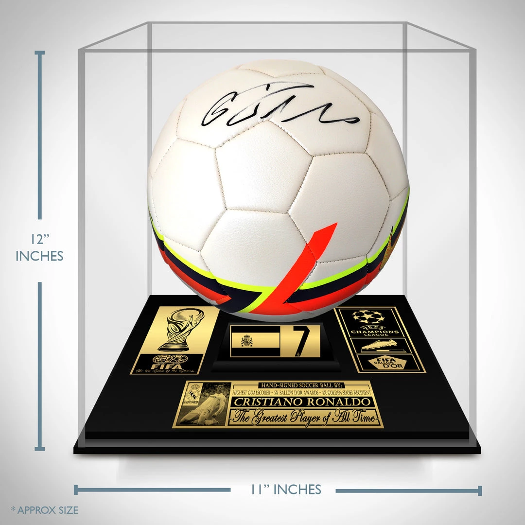 Pay homage to one of the best soccer players of all time, Cristiano Ronaldo, with this custom museum display, PSA/DNA Authenticated, Hand-Signed Nike soccer ball by Cristiano Ronaldo.