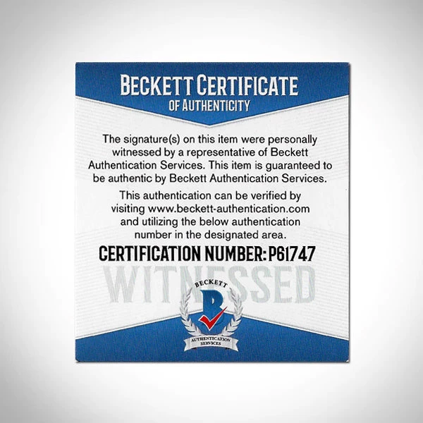 Certified by one of the most reputable autograph authentication companies in the industry. The signing of this Prop Holy Grail was personally witnessed and authenticated by one the leading authenticators in the industry, Beckett Authentication Services.