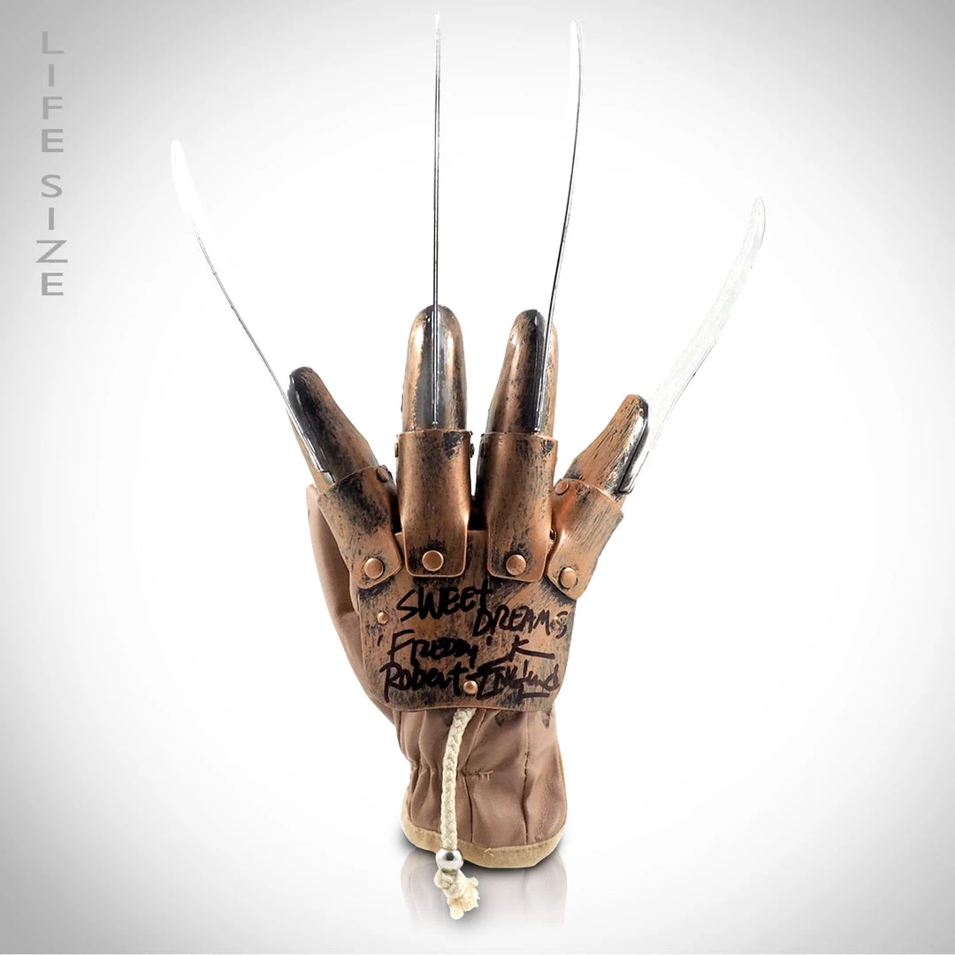 This Prop replica was based upon state-of-the-art three-dimensionally scans of the model from New Line Cinema Studios Archives, combined with high end crafting to develop the impeccable detail that this glove features. To create each hand-crafted piece, metal fingers are riveted to an authentically distressed leather-like glove. Includes a mannequin hand form for display when you’re not wearing it. The result is a fantastic realism.