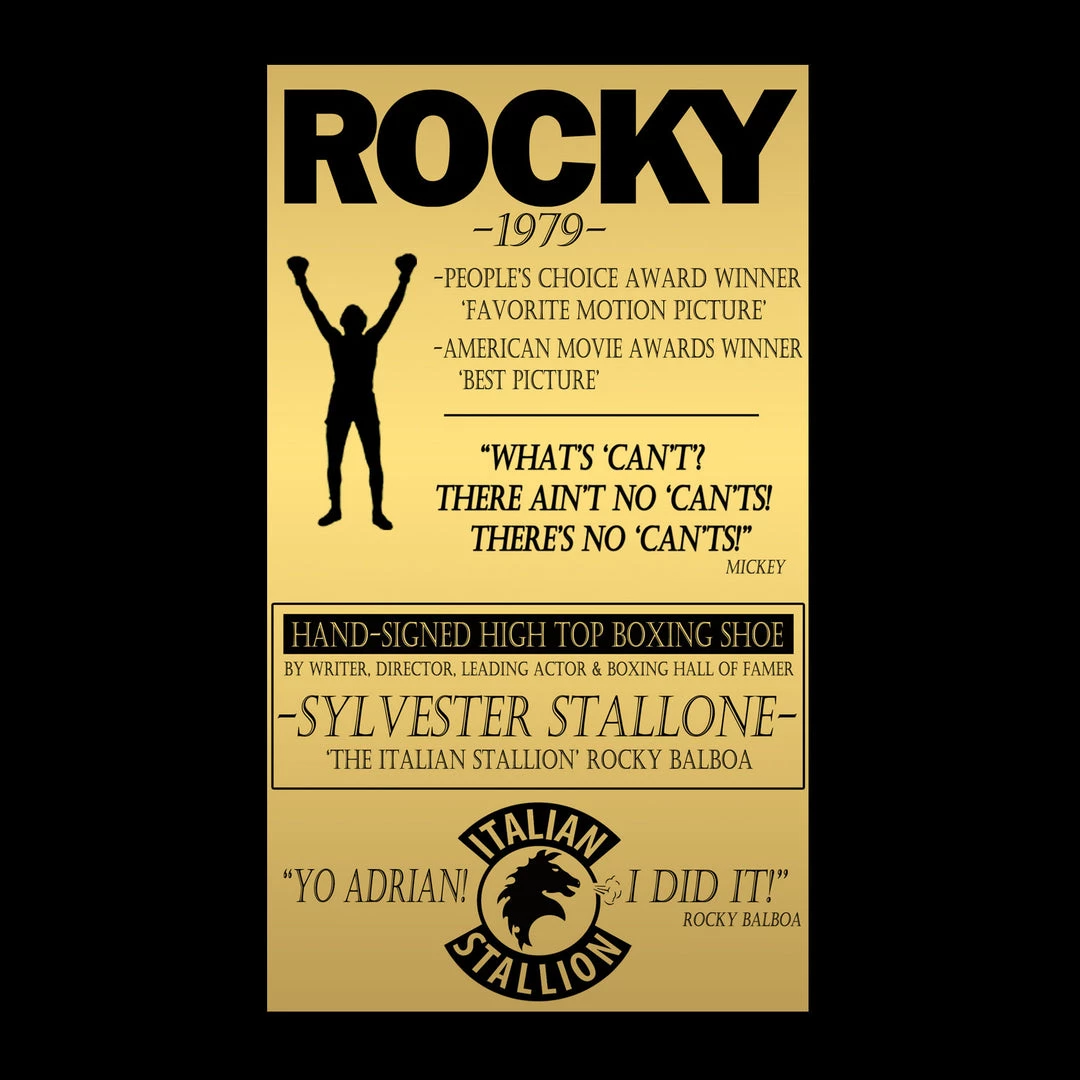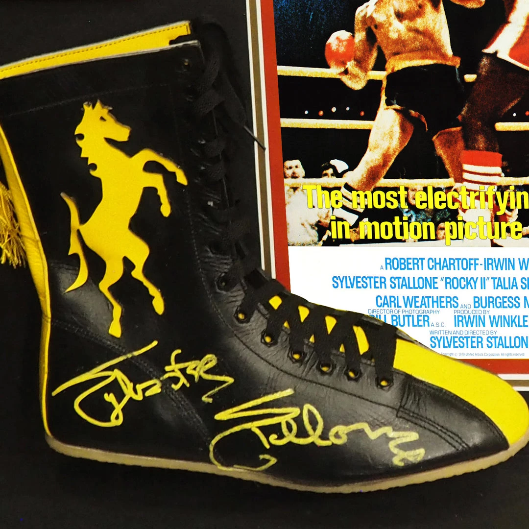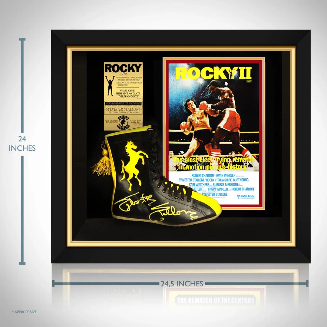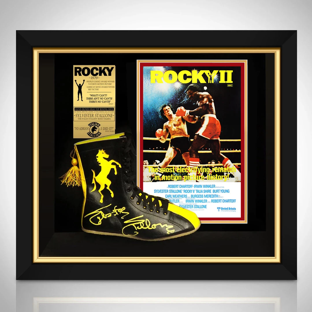The signed boot and iconic mini Rocky II poster are professionally sealed and mounted in the highest quality triple matted wood shadow box frame with metallic filet trim and finished with protective glass to keep it looking pristine. The customized descriptive metallic plaque, in addition to the detailed finishing and openings, add to the elegant and sophisticated gallery quality look.