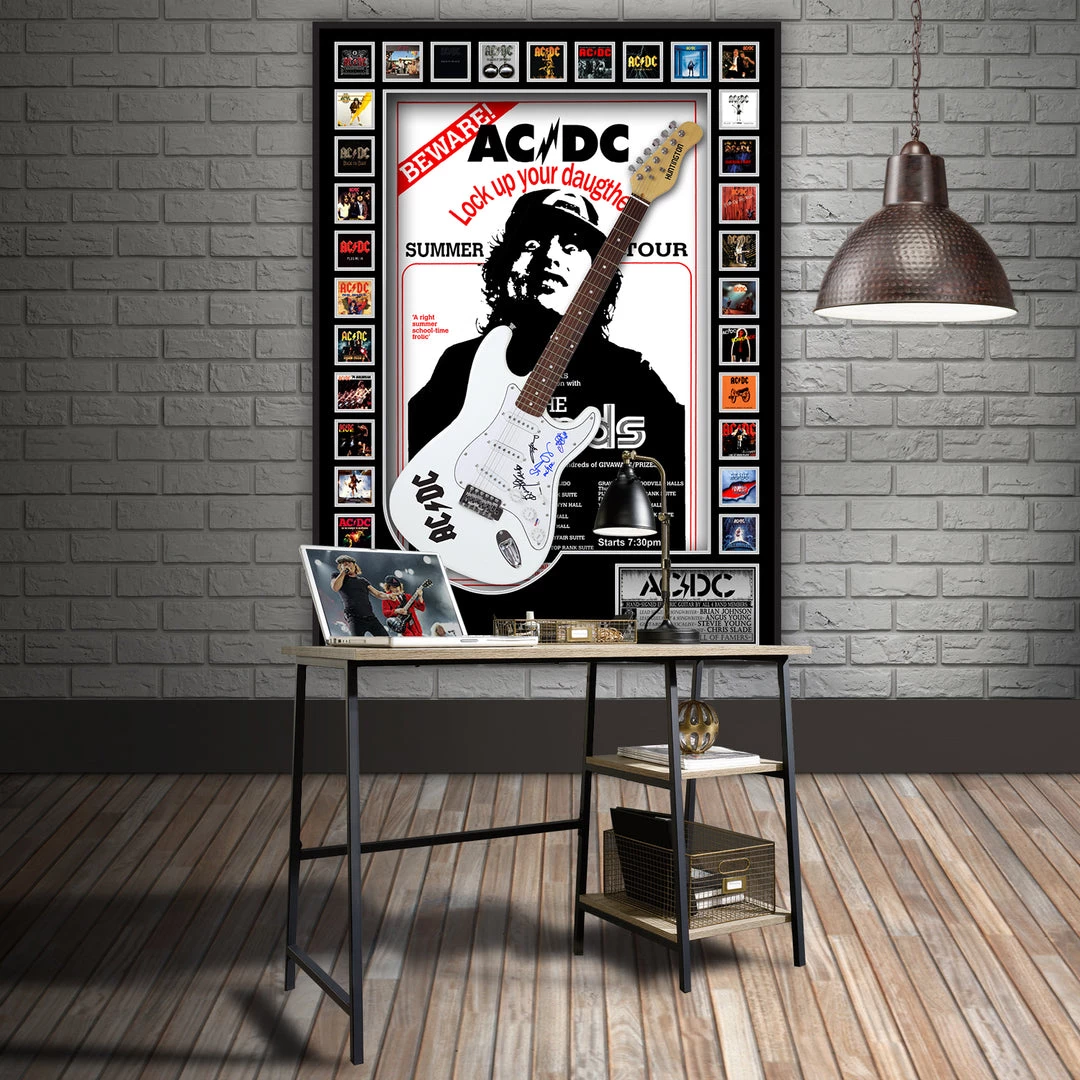 Pay homage to one of the most iconic Rock Bands of all time AC/DC with this ABSOLUTE MASTERPIECE! A gallery-framed, PSA/DNA Authenticated, Hand-Signed, Fully Functional, Electric Guitar Signed by Brian Johnson, Stevie Young, Chris Slade & Angus Young – best known as the co-founder, lead guitarist, songwriter and only constant member of the Australian hard rock band AC/DC. Angus Young was 18 when he and older brother Malcolm formed the band in 1973. They decided upon the name after seeing the letters “AC/DC” on the back of their sister Margaret’s sewing machine. He is known for his energetic performances, schoolboy-uniform stage outfits and his own version of Chuck Berry’s duck walk. Young was ranked 24th in Rolling Stone magazine’s 100 greatest guitarists of all-time list. In 2003, Young and the other members of AC/DC were inducted into the Rock and Roll Hall of Fame.