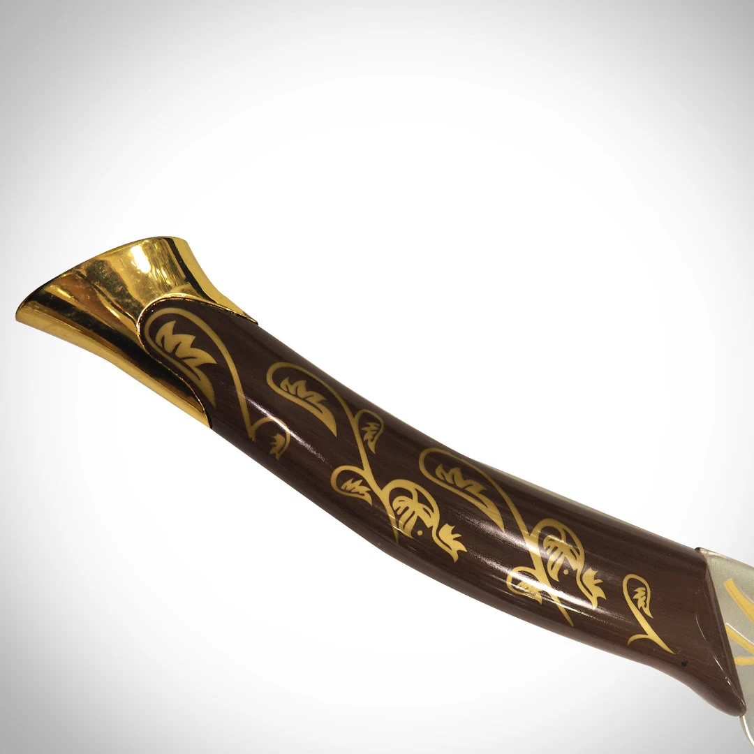 Pay homage to Lord of the Rings with this iconic Hadhafang sword. This offering is an accurately detailed prop and a tribute to the Hadhafang sword first used in the award winning movie Lord of the Rings, by the iconic character Arwen. Hadhafang was a sword once belonging to the Elven princess Idril who wed a mortal Man (Tuor) and bore Eärendil, the father of Elrond, who in turn was father to Arwen. Hadhafang was wielded by Elrond during the battle between the Last Alliance of Elves and Men and the forces of the Dark Lord Sauron on the slopes of Mount Doom. The blade is inscribed with Tengwar runes in Sindarin that say “Aen estar Hadhafang i chathol hen, thand arod dan i thang an i arwen.”, which translates to “This blade is called Hadhafang, a noble defense against the enemy throng for a noble lady.” Forged by hand out of stainless steel, and measuring 38 inches, it is beautifully decorated with an artistic wooden handle and golden pommel.