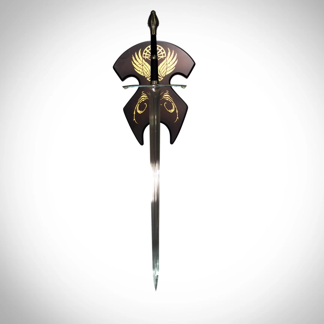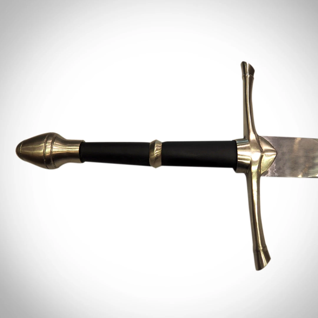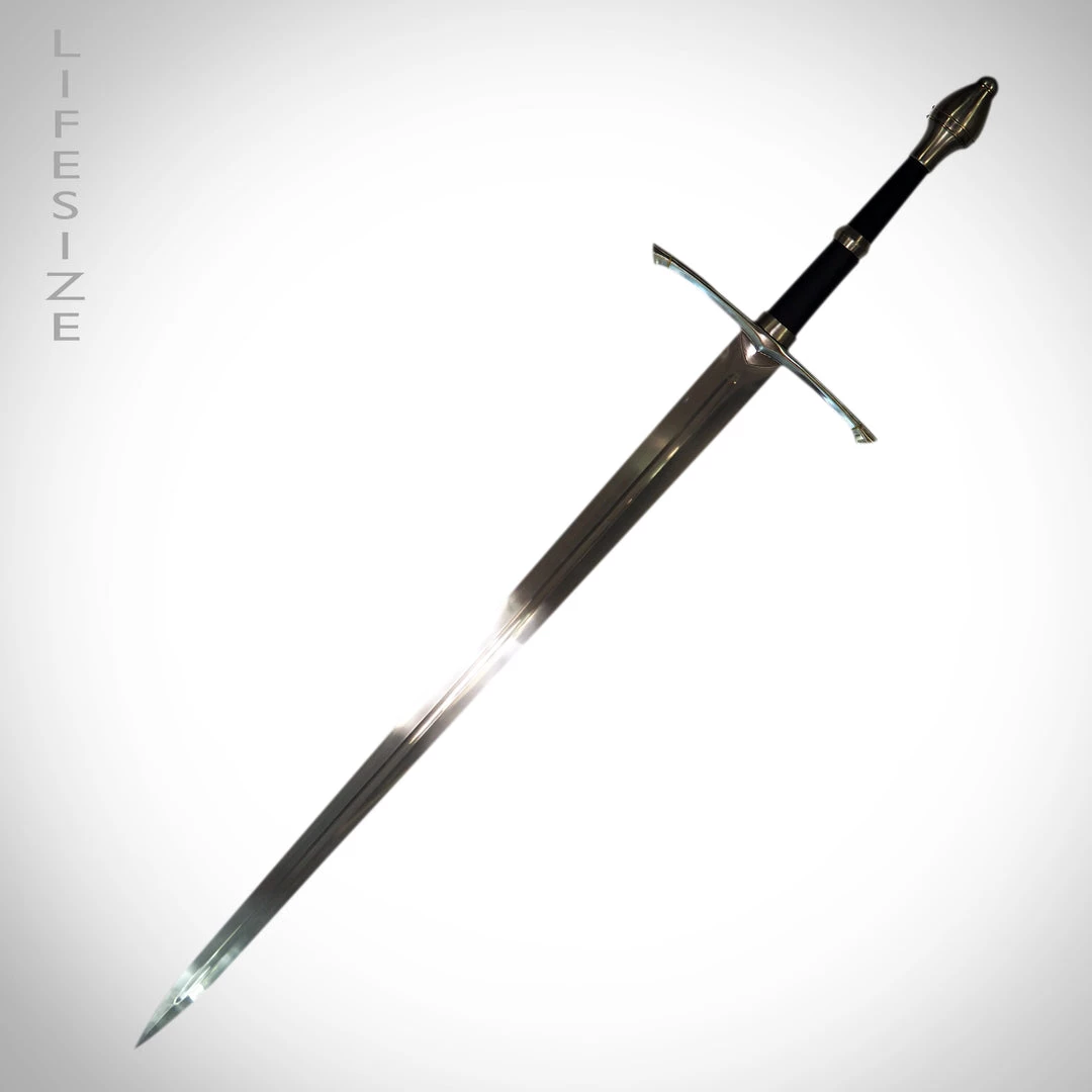 Pay homage to Lord of the Rings with this iconic Aragorn’s (Strider) first sword, a Dúnedain chieftain’s longsword that Aragorn uses before receiving the reforged Andúril. It is a hand-and-a-half sword, with a black leather-wrapped grip, a scent-topper pommel, and a long, tapering blade. Forged by hand out of stainless steel and measuring 50 inches, it comes complete with Aragorn’s dagger and matching, elegant black sheath