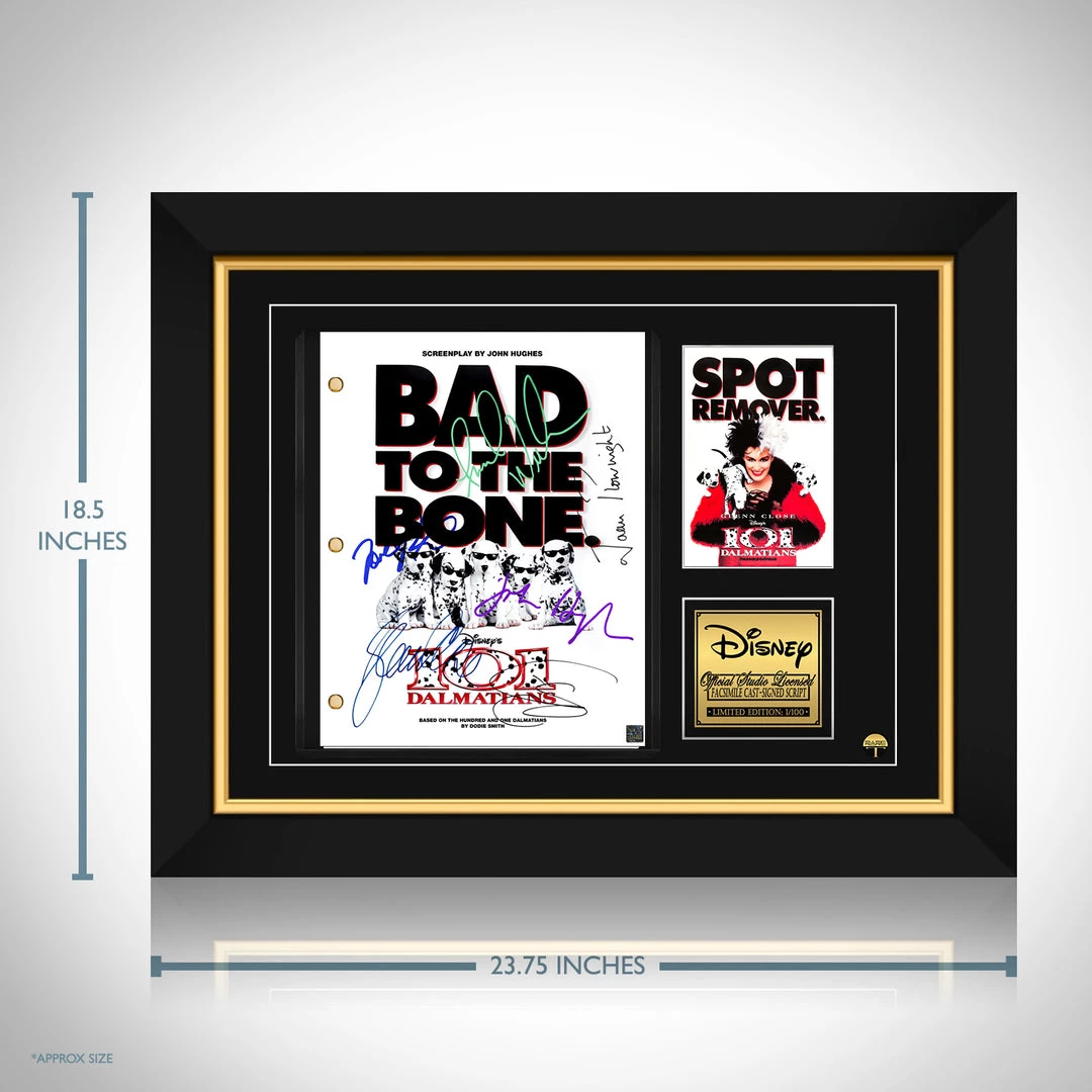 Pay homage to 101 Dalmatians , with this Walt Disney Studios fully licensed facsimile of the official signed movie Transcript , originally signed by actors John Hughes, Glenn Close, Jeff Daniels, Joely Richardson, Joan Plowright & Frank Welker , of which is strictly limited to 100 units Worldwide and has been approved and numbered accordingly.