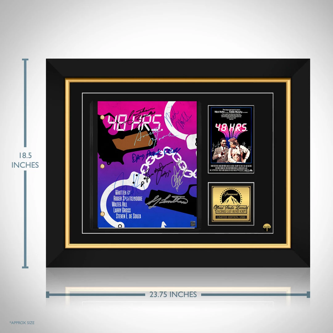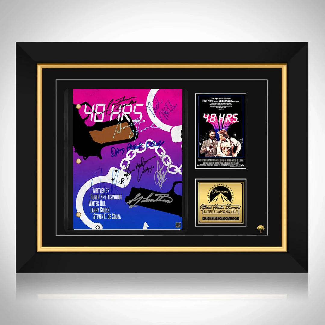 Pay homage to 48 Hrs , with this Paramount Pictures fully licensed facsimile of the official signed movie script, originally signed by actors Nick Nolte, Eddie Murphy, Annette O’Toole, James Remar, David Patrick Kelly, Sonny Landham , Brion James & Jonathan Banks , of which is strictly limited to 100 units Worldwide and has been approved and numbered accordingly.