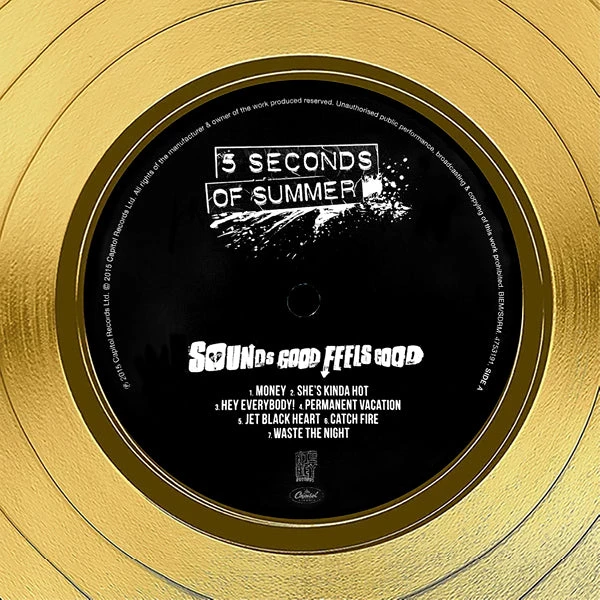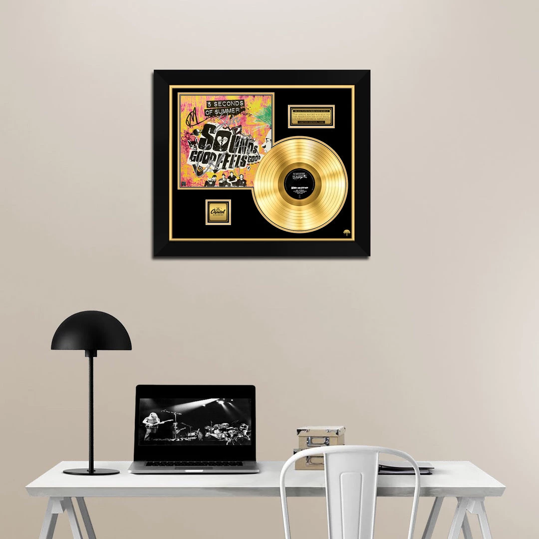 Pay homage to one of the most iconic Australian pop rock band of all time 5 Seconds of Summer , with this gallery-framed, authentic Capitol Recordings fully licensed facsimile of the official Hand-Signed 24K Gold LP Record and LP Cover Sounds good feels good Originally signed by Luke Hemmings, Michael Clifford, Calum Hood & Ashton Irwin , of which is strictly limited to 100 units Worldwide and has been approved and numbered accordingly.
