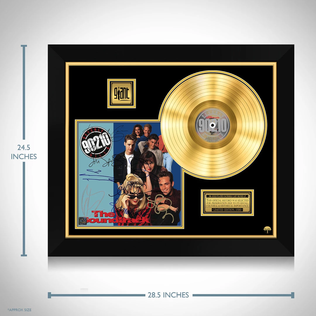 Pay homage to one of the most iconic Tv Series of all time 90210 , with this gallery-framed, authentic Giant Records fully licensed facsimile of the official Hand-Signed 24K Gold LP Record and LP Cover soundtrack Originally signed by Jennie Garth, Ian Ziering, Brian Austin Green, Tori Spelling, Jason Priestly, Luke Perry, Gabrielle Carteris & Shannen Doherty , of which is strictly limited to 100 units Worldwide and has been approved and numbered accordingly.
