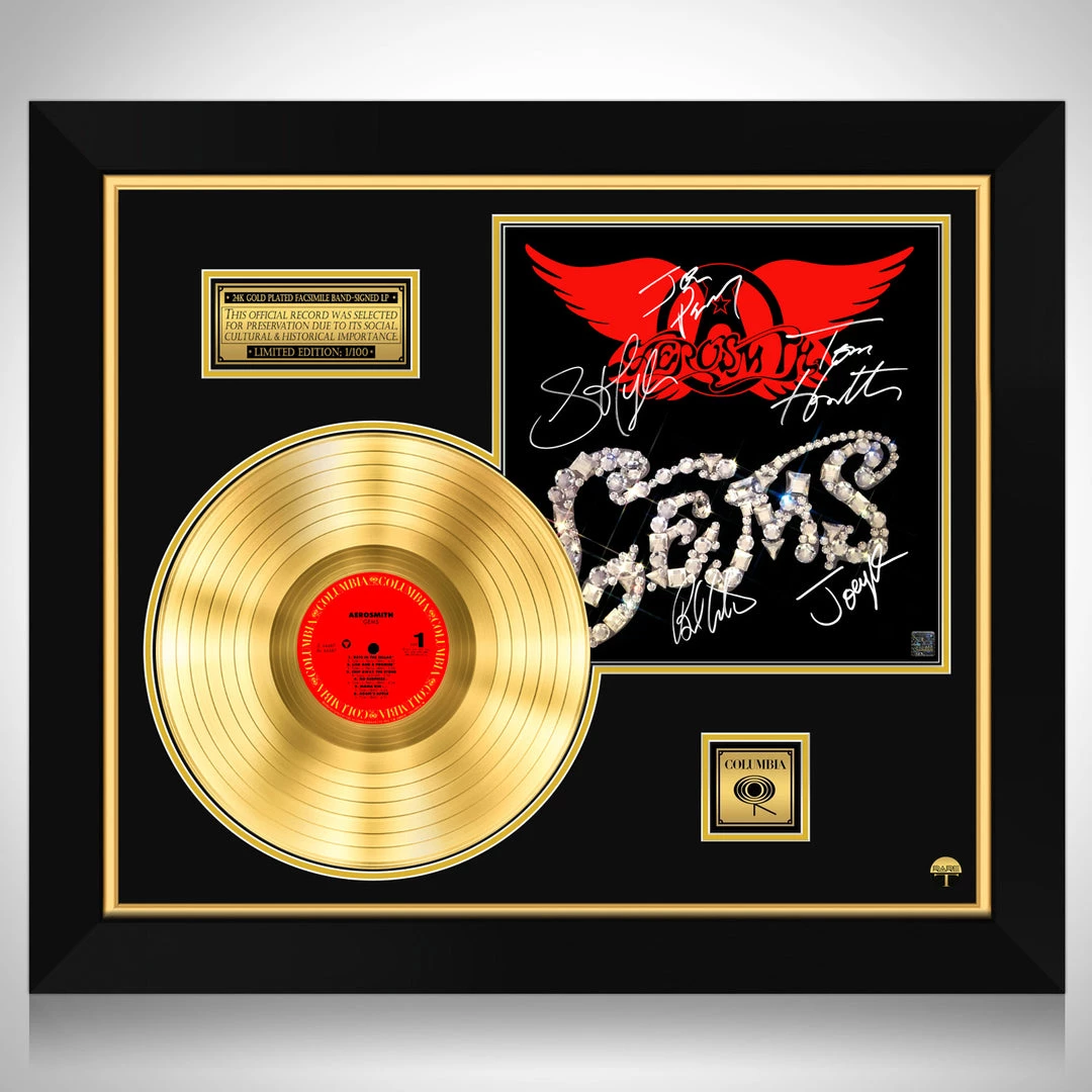 Pay homage to one of the world’s best selling and most influential rock bands of all time, Aerosmith, with this gallery-framed, authentic, Columbia Records fully licensed facsimile of the official Hand-Signed 24k Gold Plated LP Record and LP Cover ‘Gems‘ Originally signed by band members such as Joe Perry, Joey Kramer and Steven Tyler, of which is strictly limited to 100 units Worldwide and has been approved and numbered accordingly.