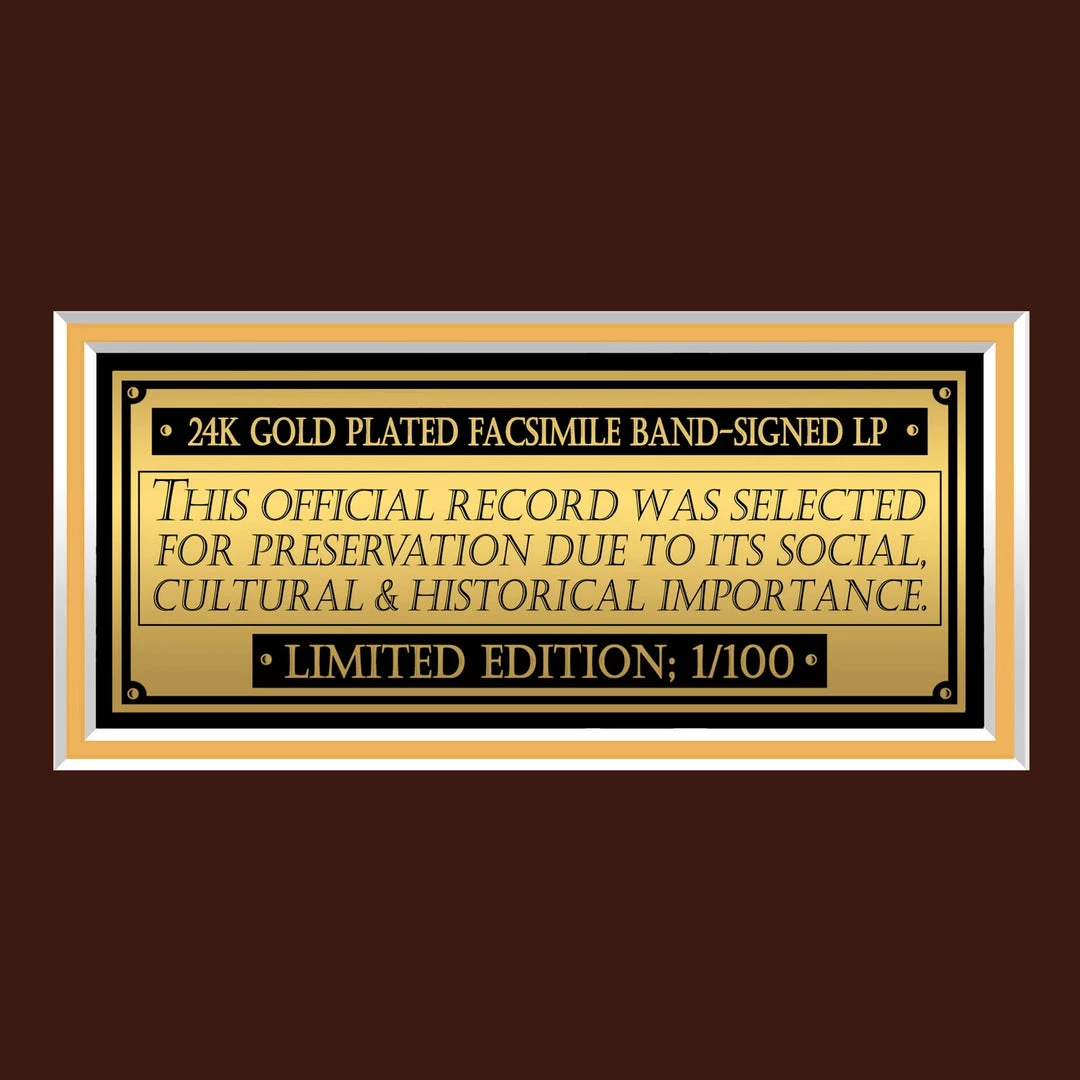 The 24K Gold Plated LP and album cover facsimile are both professionally mounted in the highest quality triple matted wood shadow box frame with metallic fillet trim and finished with protective glass to keep it looking pristine. The customized descriptive metallic plaque, in addition to the detailed finishing and openings, add to the elegant and sophisticated gallery quality look.