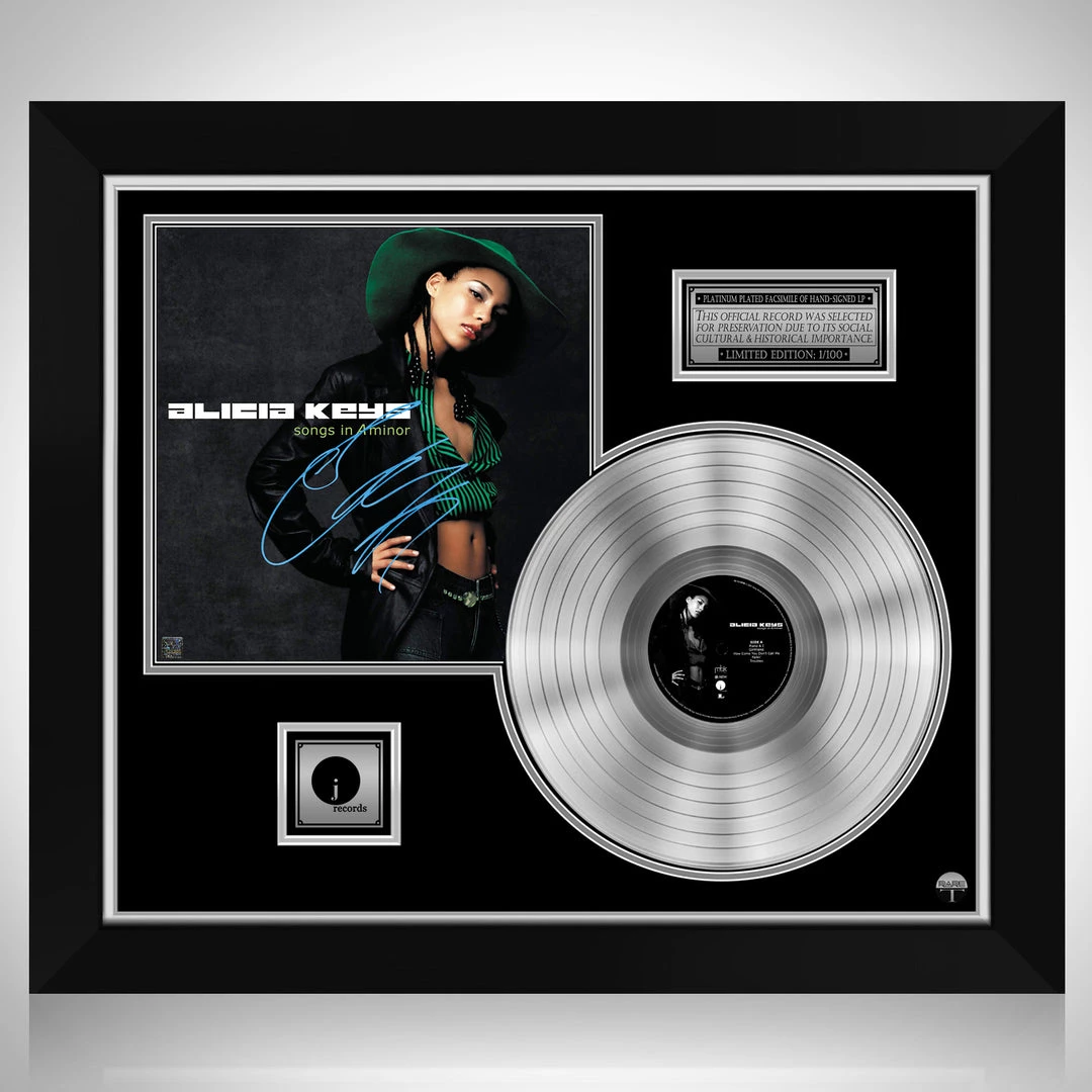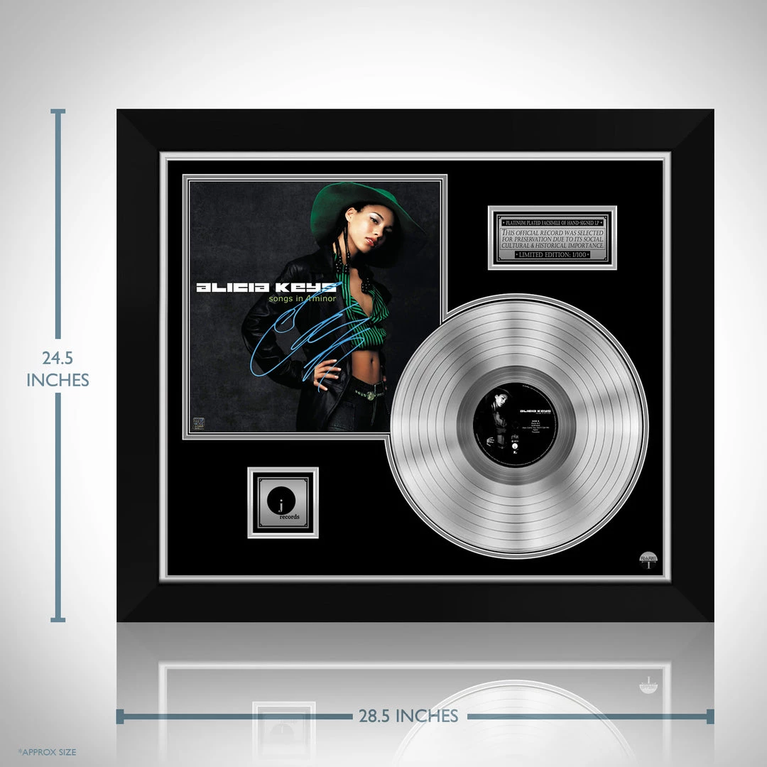 Pay homage to one of the most iconic American singer-songwriter of all time Alicia Keys , with this gallery-framed, authentic J Records fully licensed facsimile of the official Hand-Signed Platinum Plated LP Record and LP Cover Songs in a Minor Originally signed by Alicia Keys , of which is strictly limited to 100 units Worldwide and has been approved and numbered accordingly.