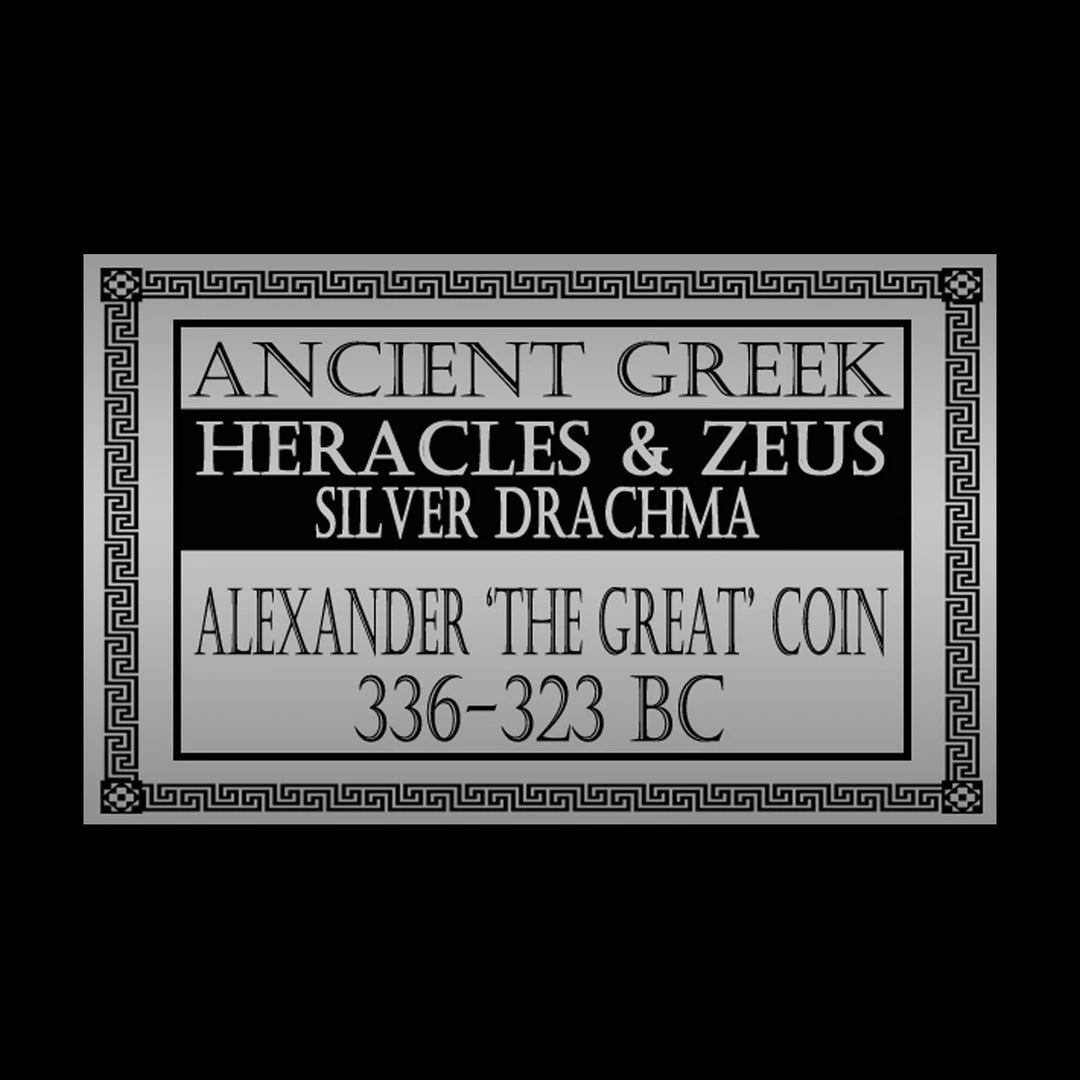 This custom museum display showcases an Authentic Ancient Greek Silver coin (Drachma) Minted in Macedonia for Alexander The Great, dating from 336-323 BC