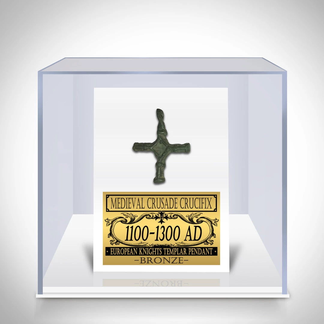 This custom museum display showcases an Authentic Medieval Templar cross/Crucifix pendant dating from circa 1100-1300AD. Very nicely preserved, it belonged to European Crusaders of Medieval Spanish Kings. The crusade cross/Crucifix pendant is in cast in bronze.