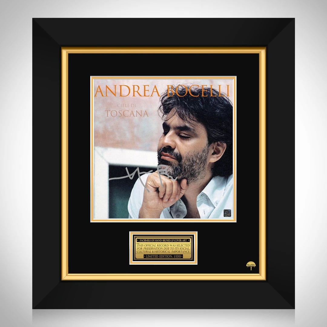 Pay homage to one of the most iconic Italian opera tenor of all time, Andrea Bocelli , with this gallery-framed, officially licensed, limited edition facsimile of the Hand-Signed Cieli Di Toscana LP Cover originally signed by Andrea Bocelli , of which is strictly limited to 100 units Worldwide, and has been approved and numbered accordingly.